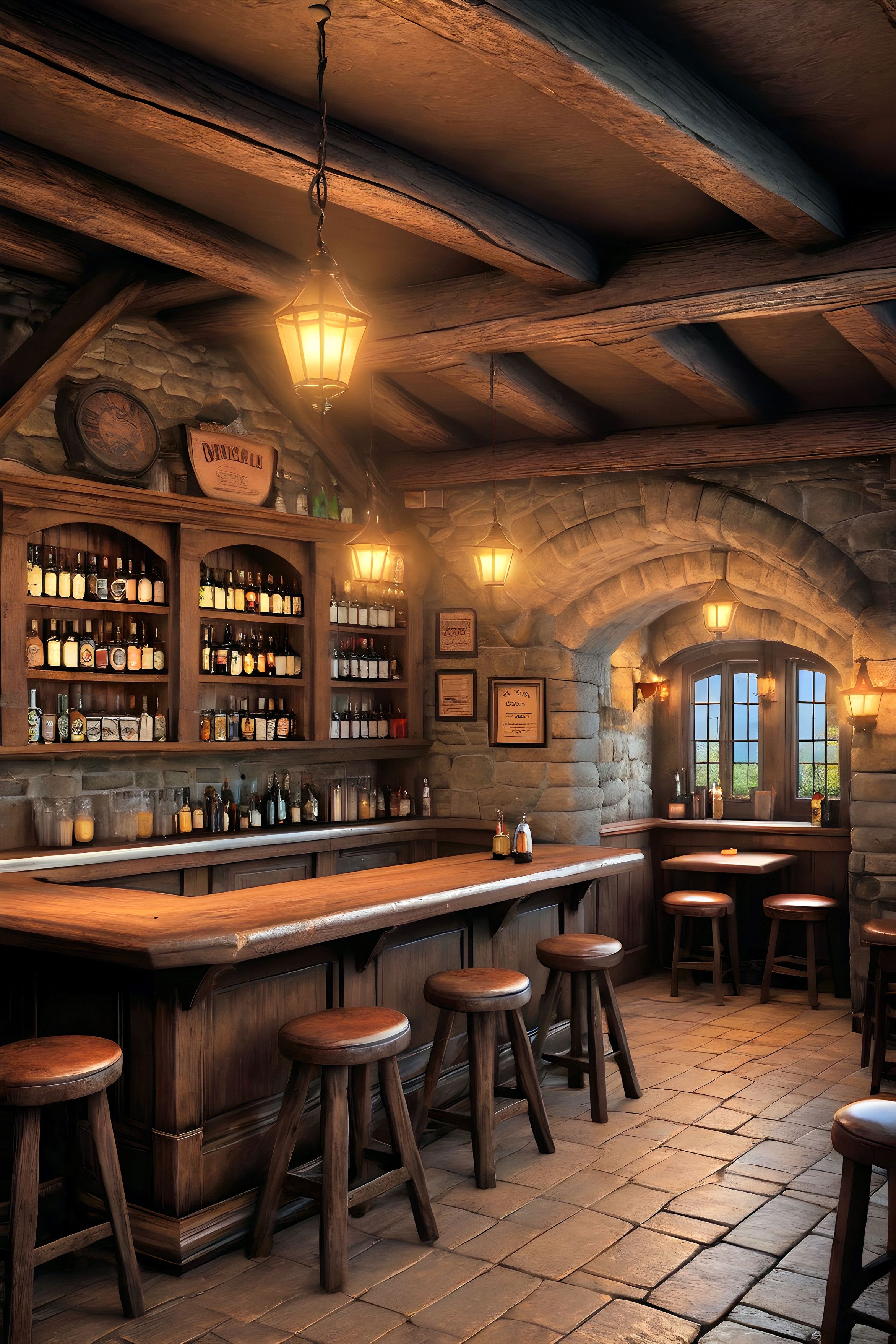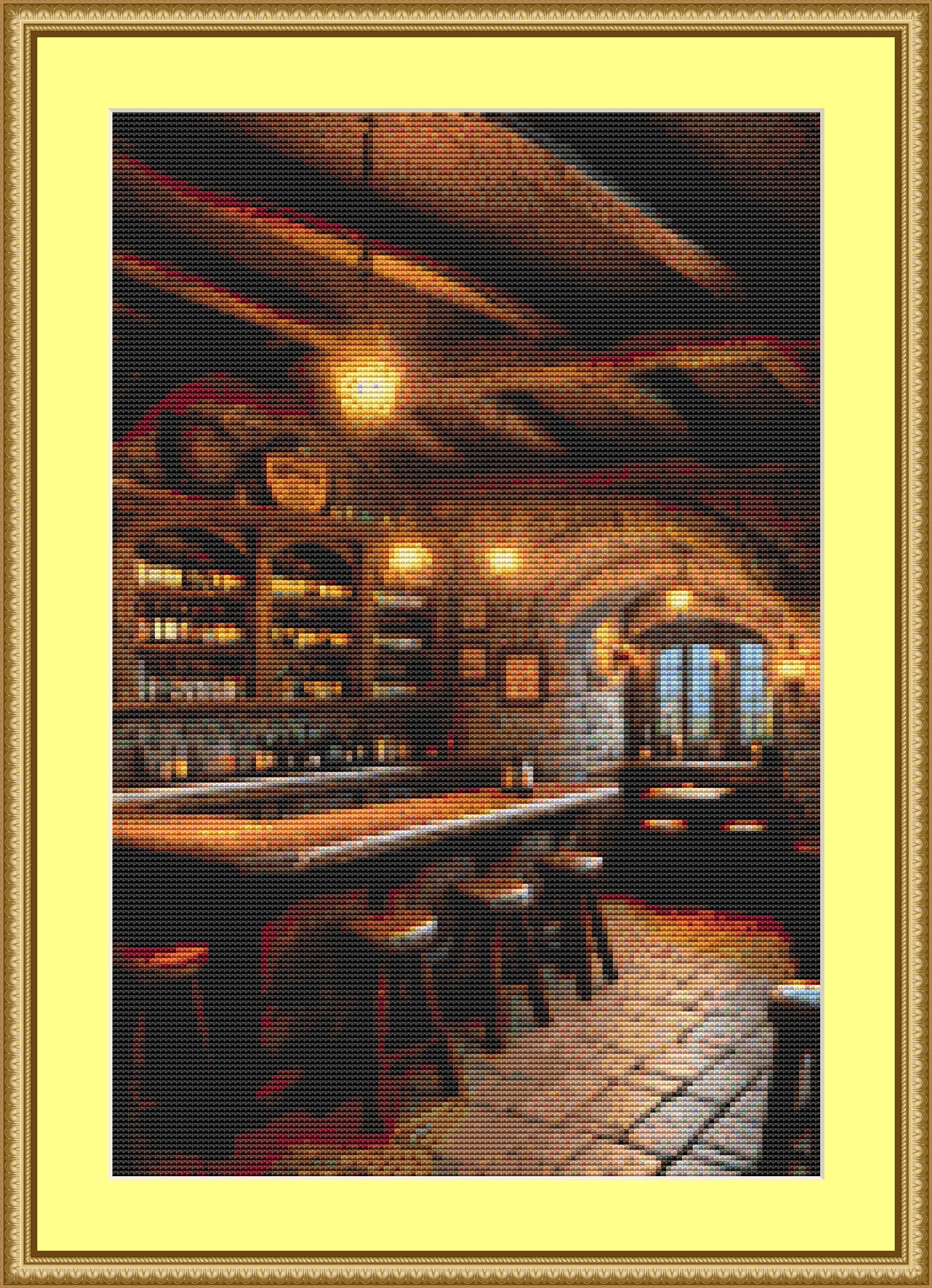 This cross stitch pattern depicts a picture of the interior of a quaint English pub.