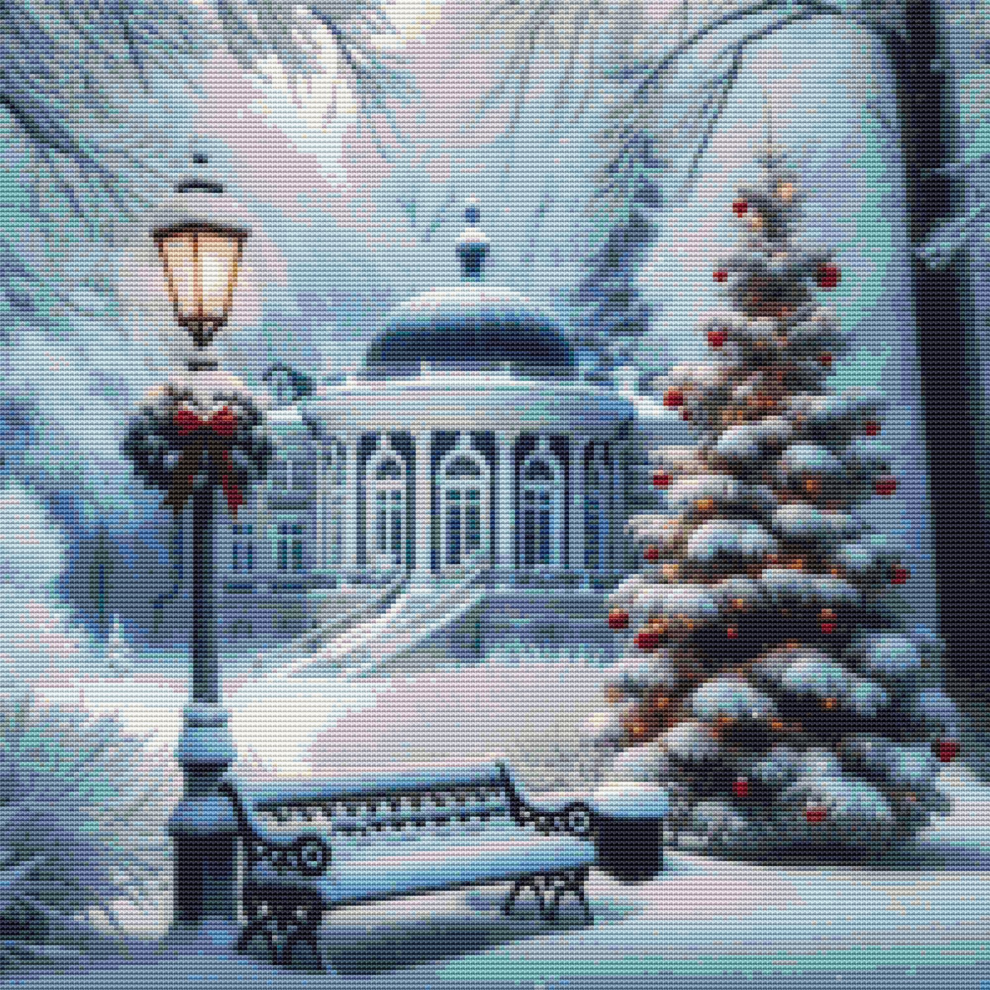 This cross stitch pattern of a Christmas tree outside in the snow.