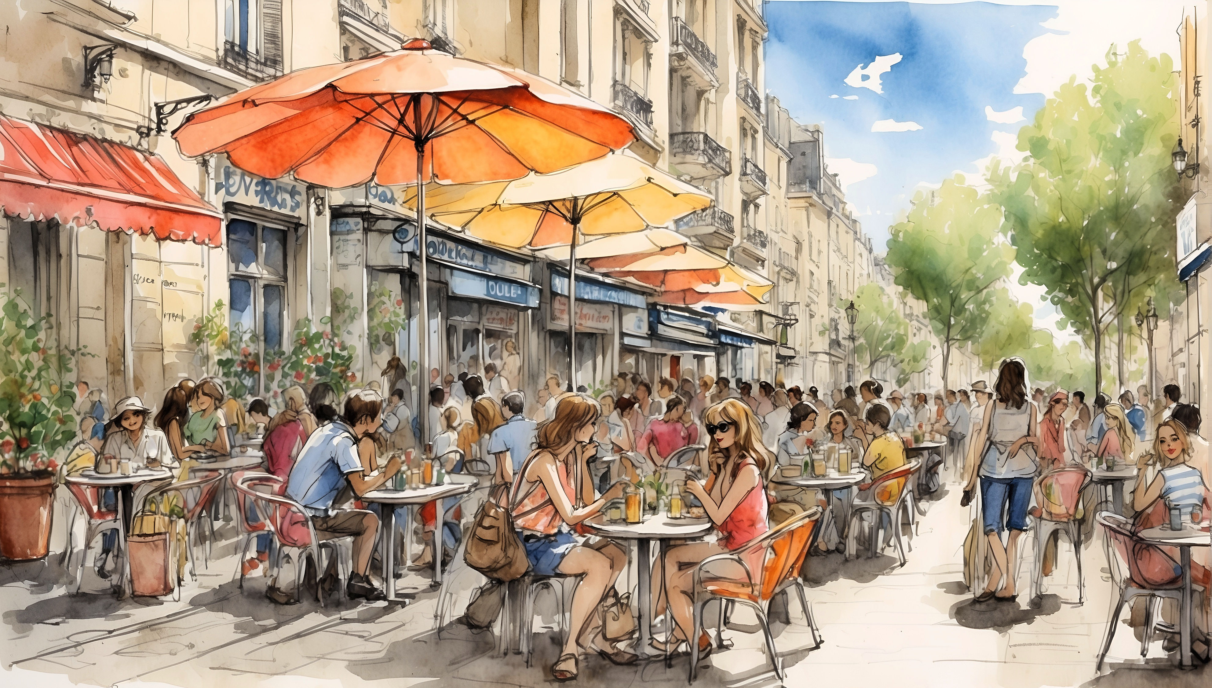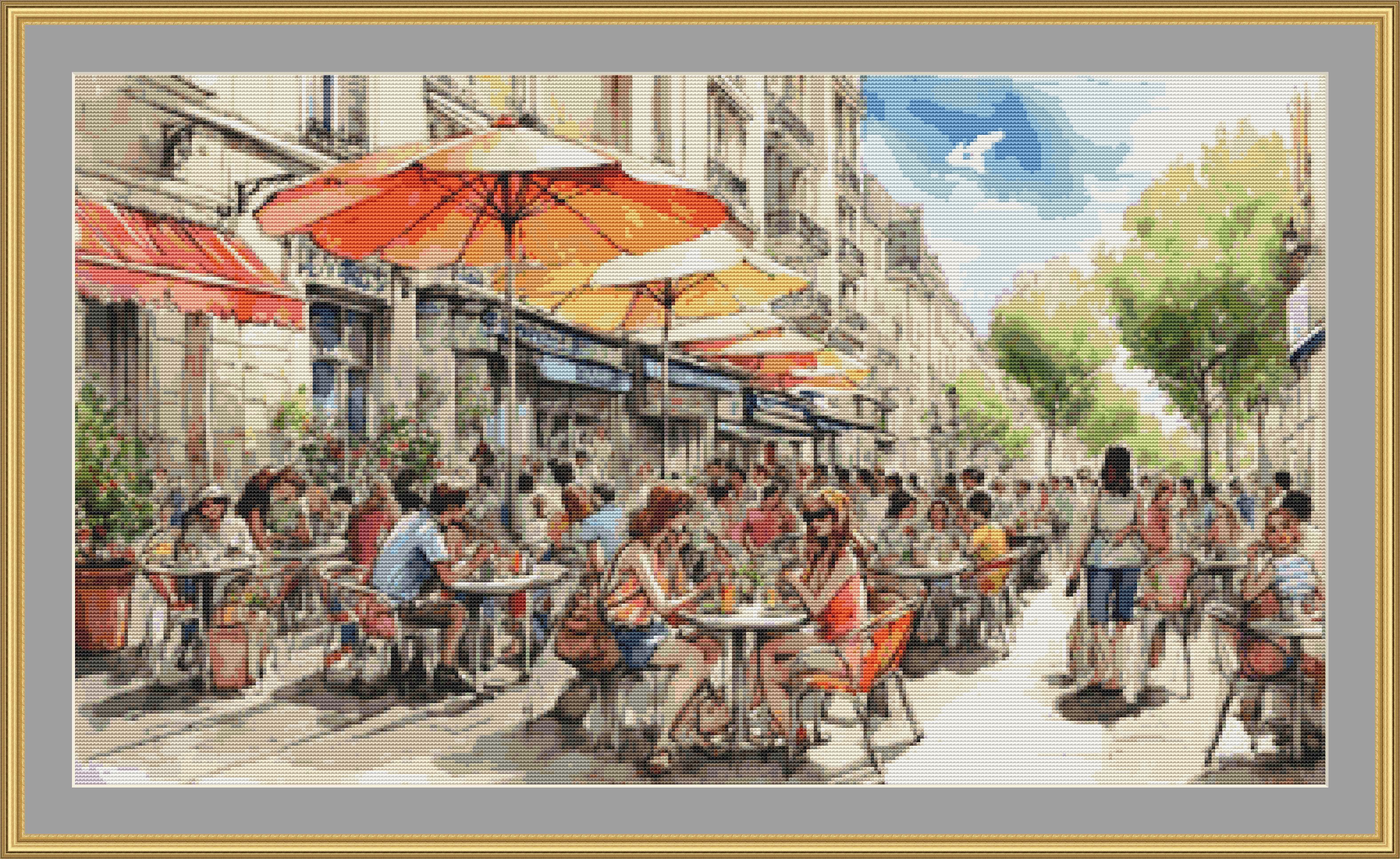 This cross stitch pattern of a busy cafe in a street in Paris.