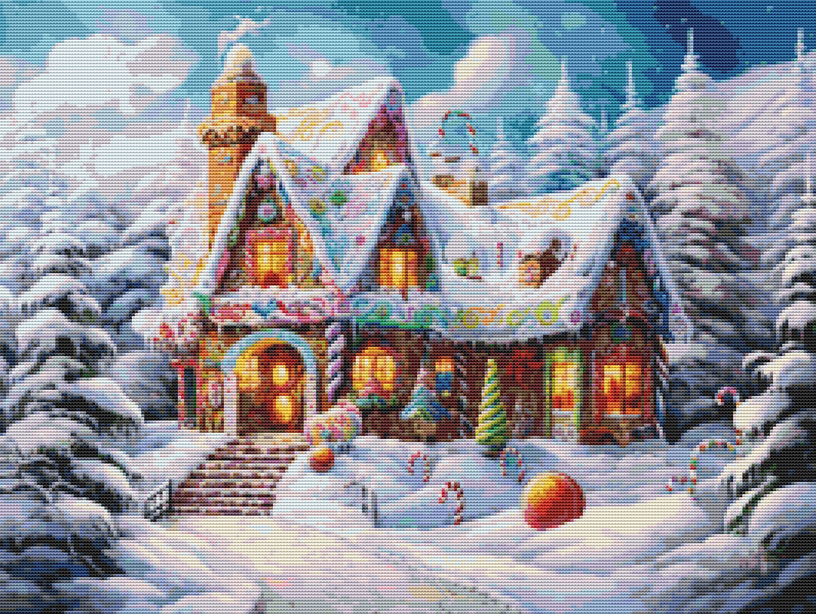 This cross stitch pattern of a gingerbread house covered in sweets.