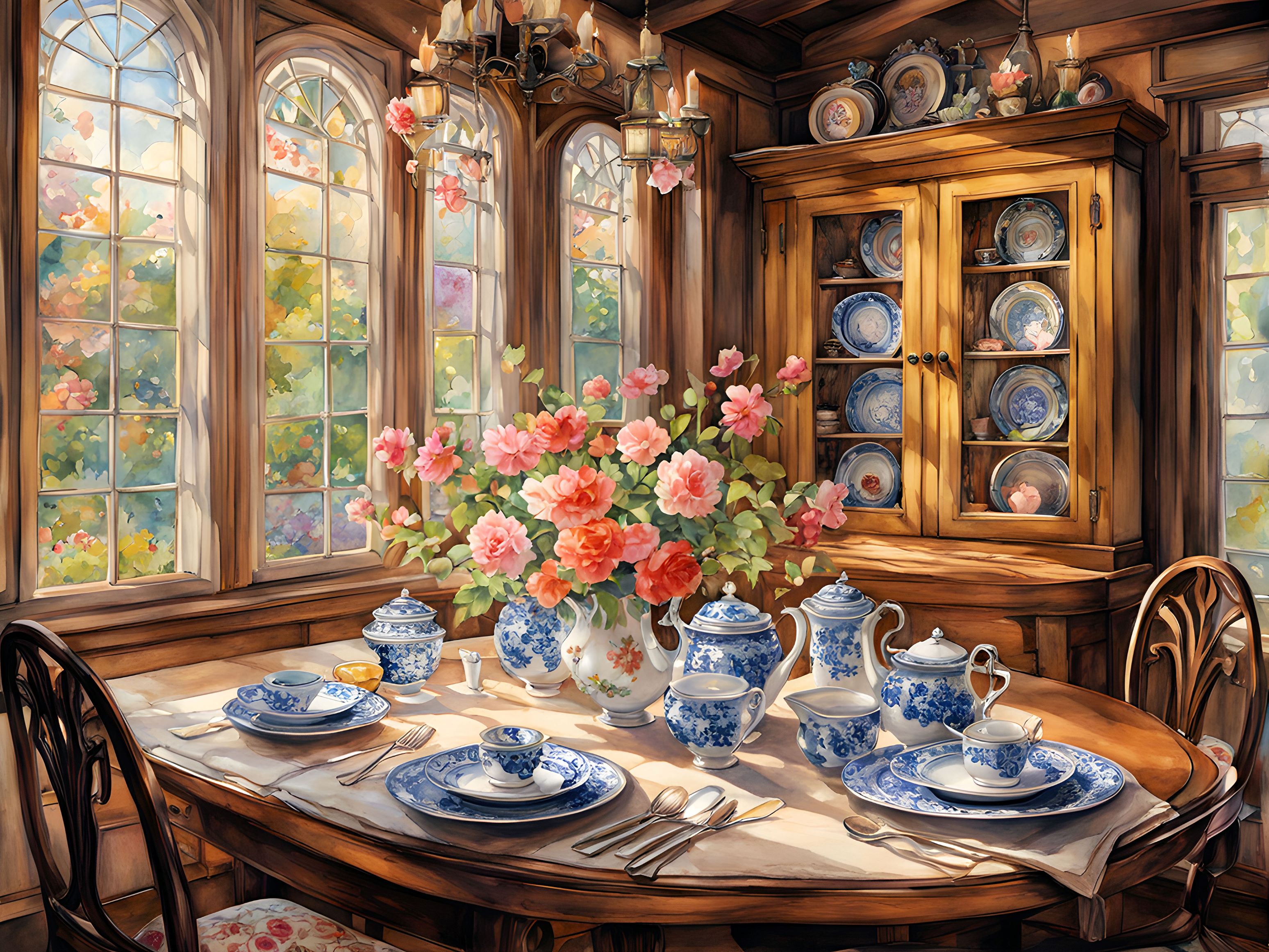 This cross stitch pattern of an elegant dining room from the Victorian era.