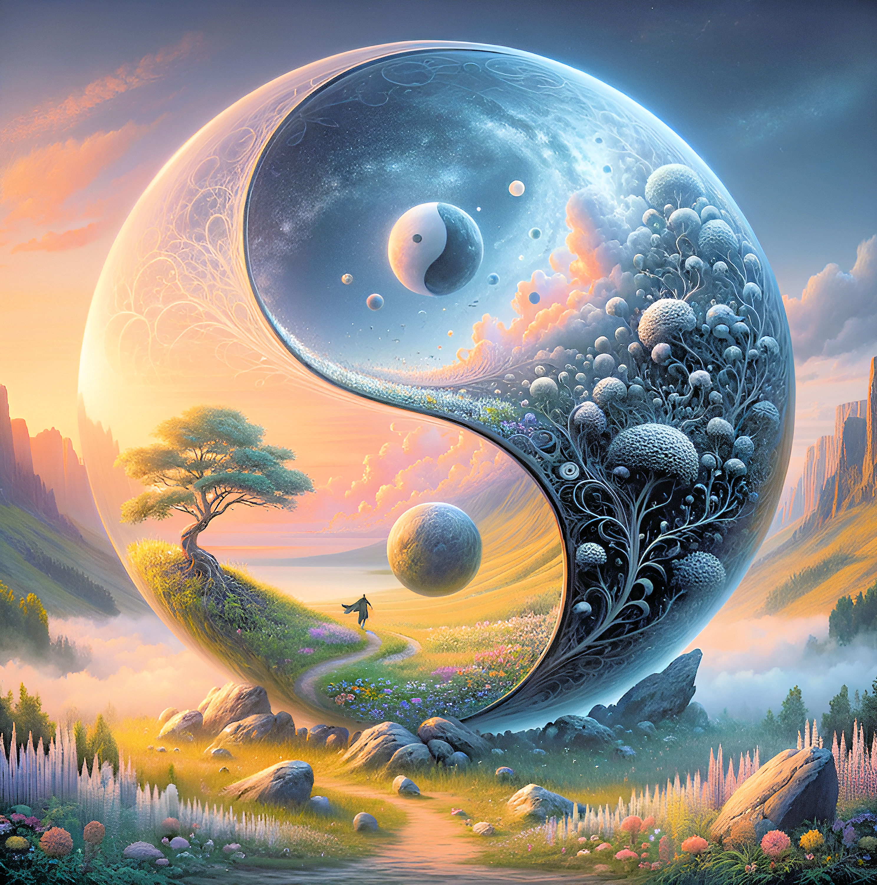 This cross stitch pattern of some a man walking on a path inside an orb with the pattern of Yin Yang, showing day and night.