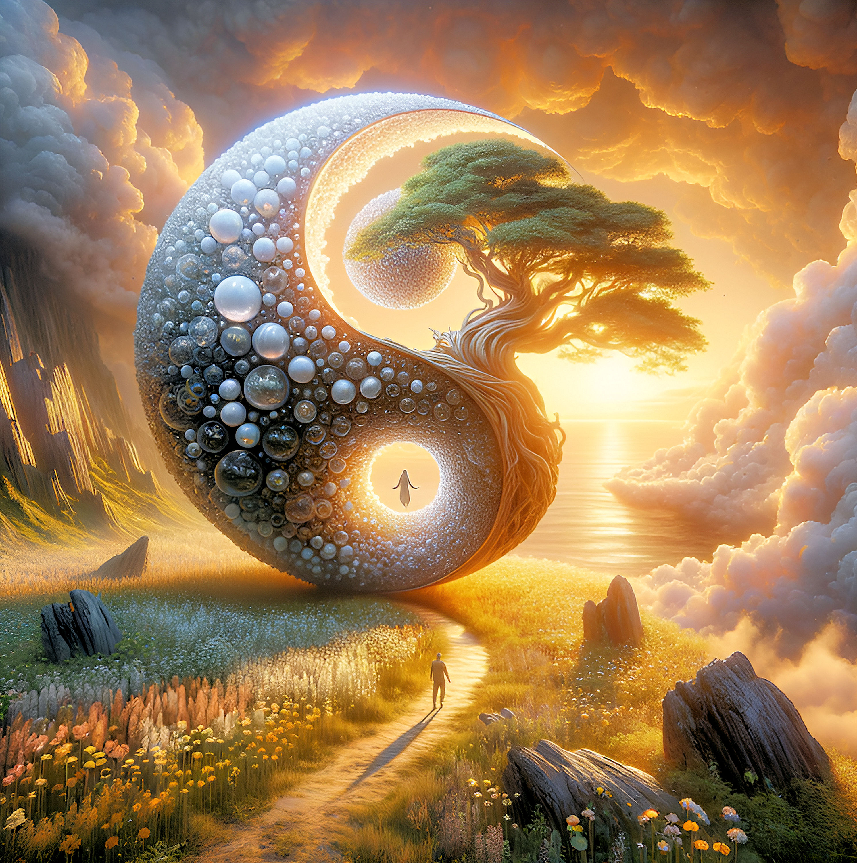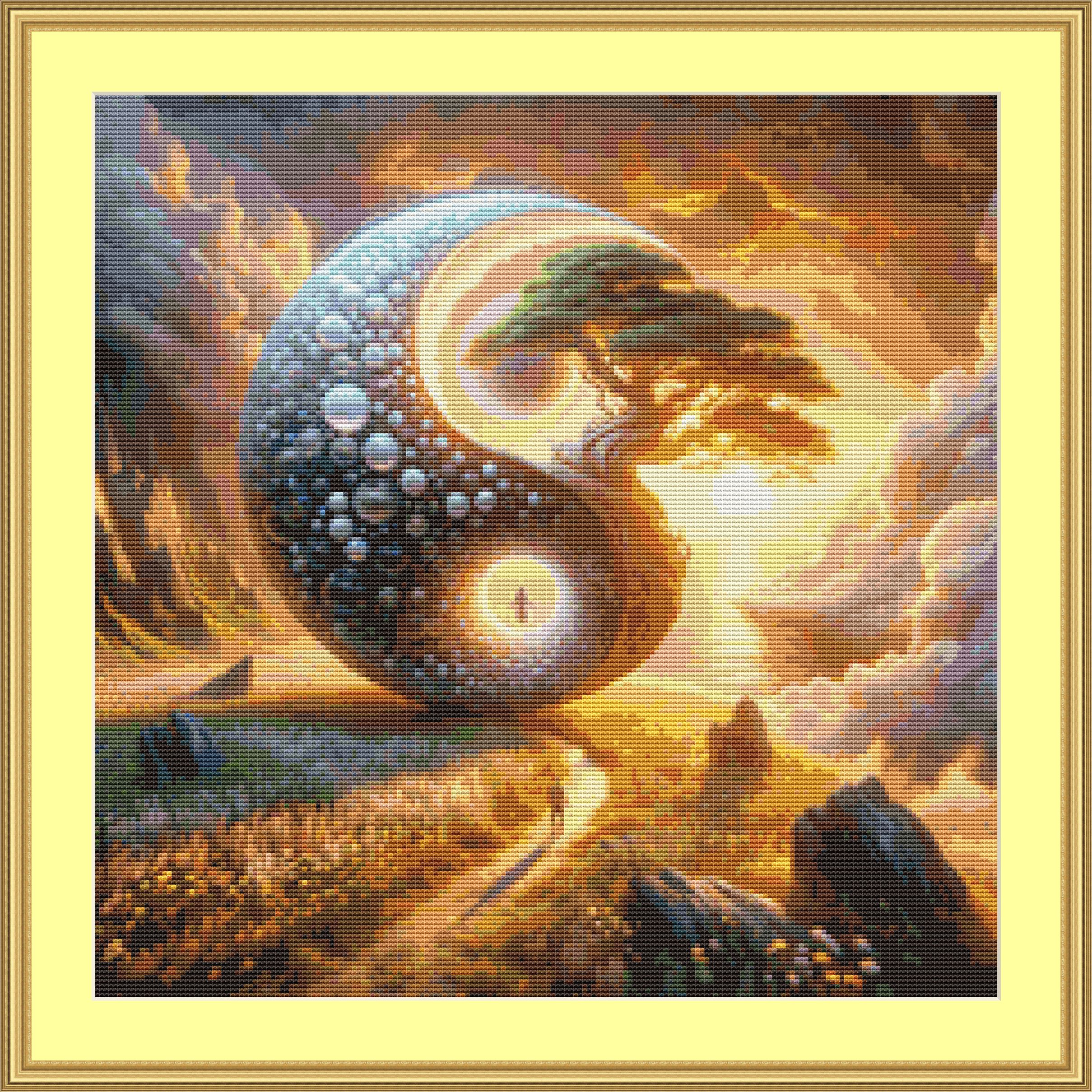 This cross stitch pattern of some a man walking on a path towards an orb with the pattern of Yin Yang with a woman waiting and a tree growing in one half.