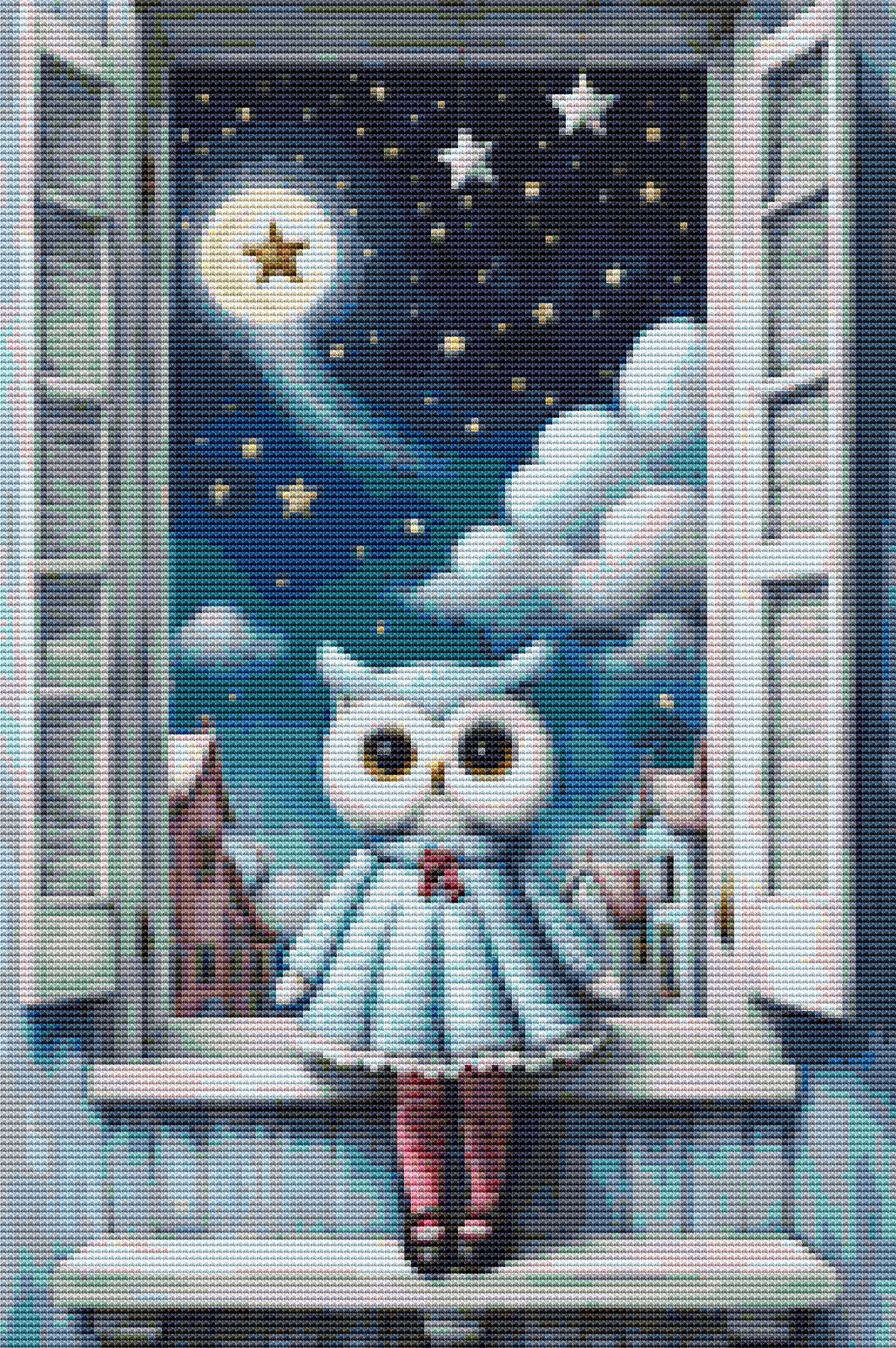 This cross stitch pattern of an owl sat at a window making a wish on a star.
