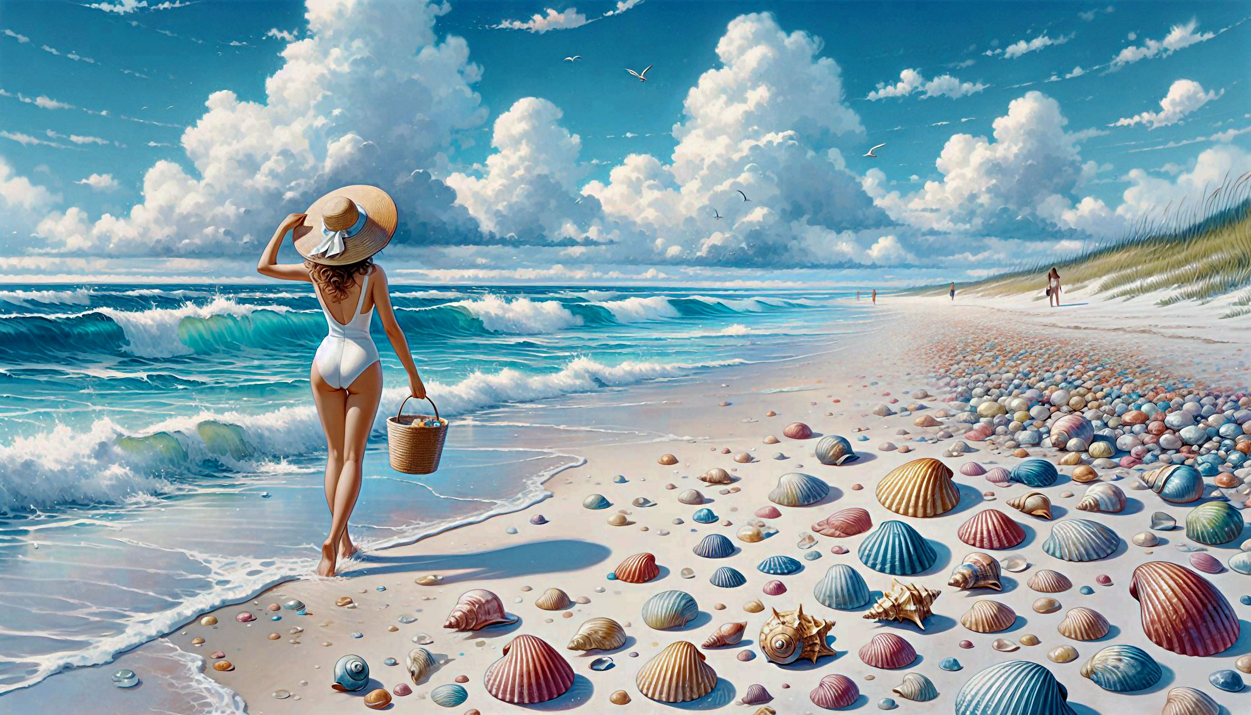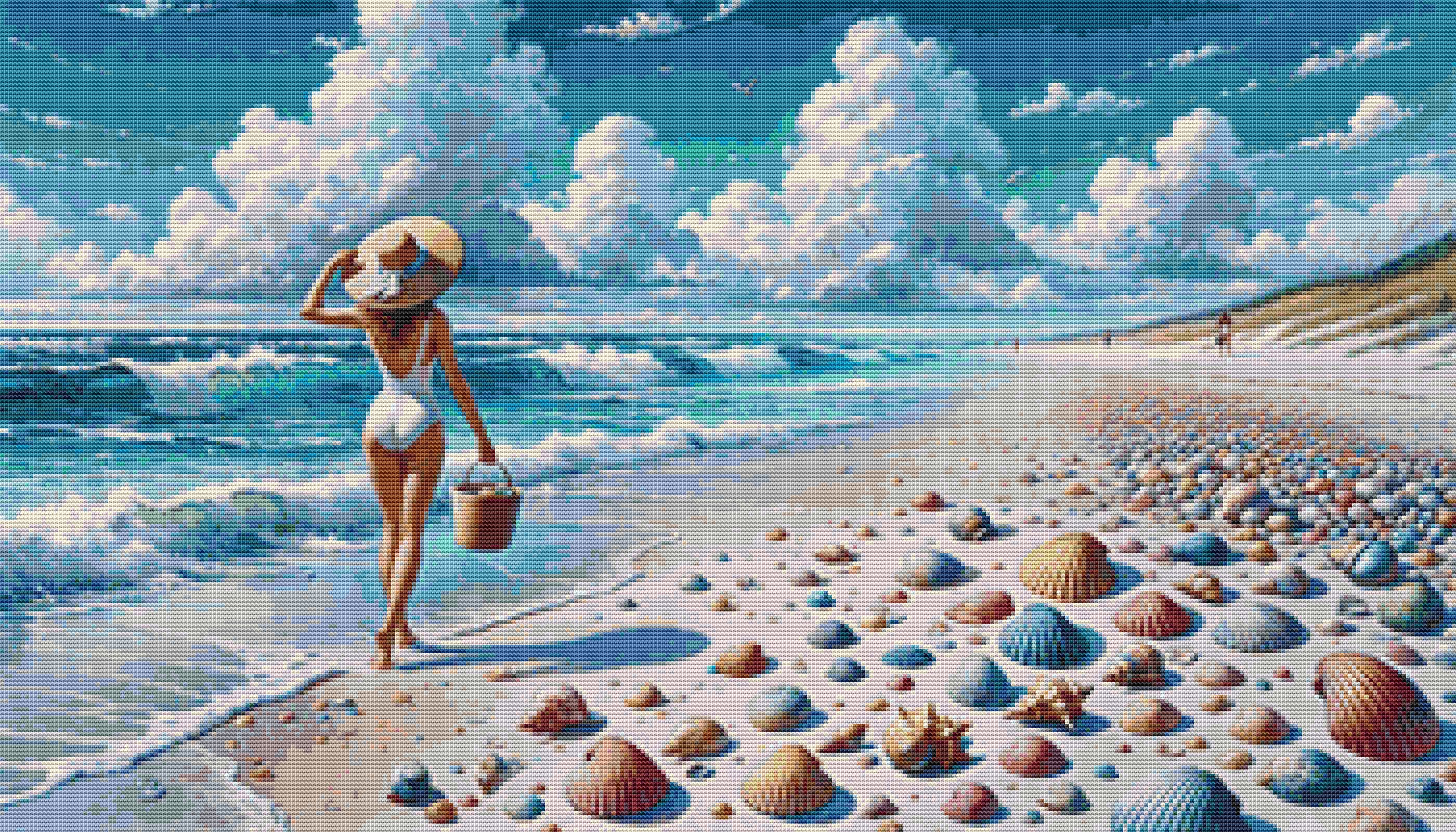 This cross stitch pattern of a woman walking on a beach wearing a white swimsuit.