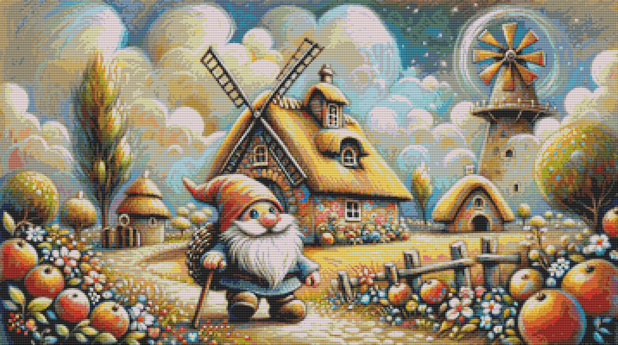 This cross stitch pattern of a gnome walking past some windmills in a whimsical setting.