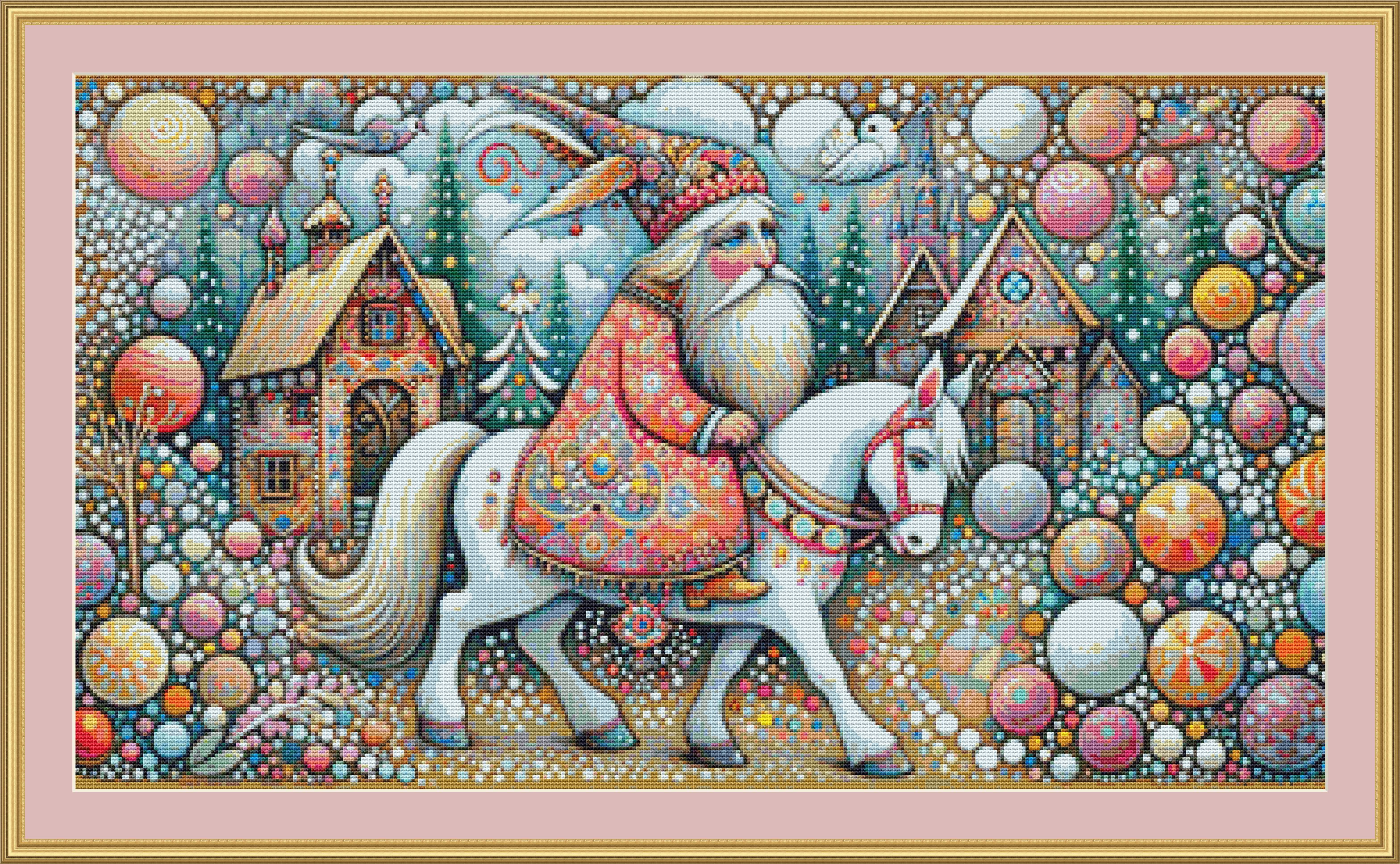 This cross stitch pattern of Santa riding a white horse in a whimsical world.