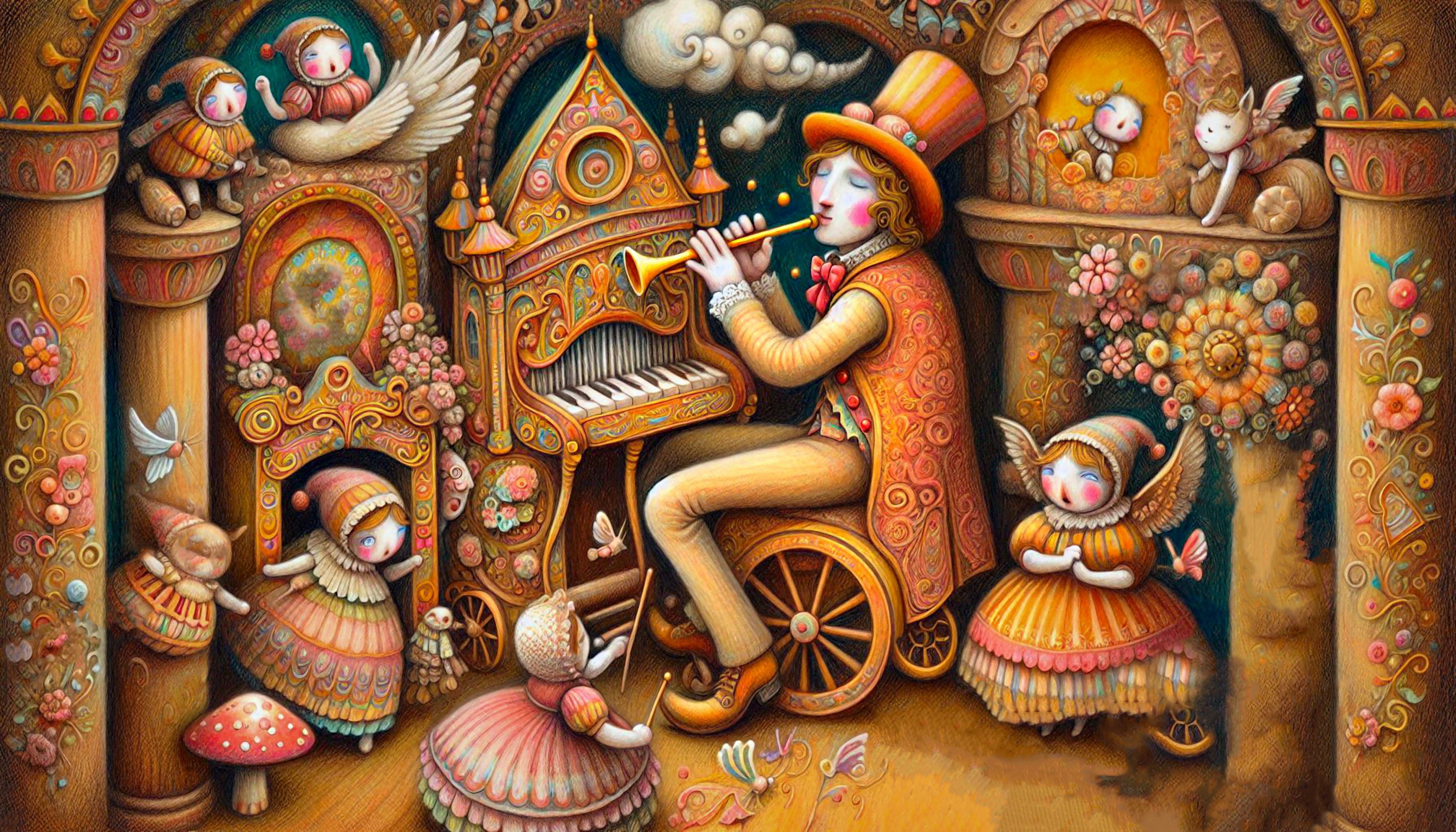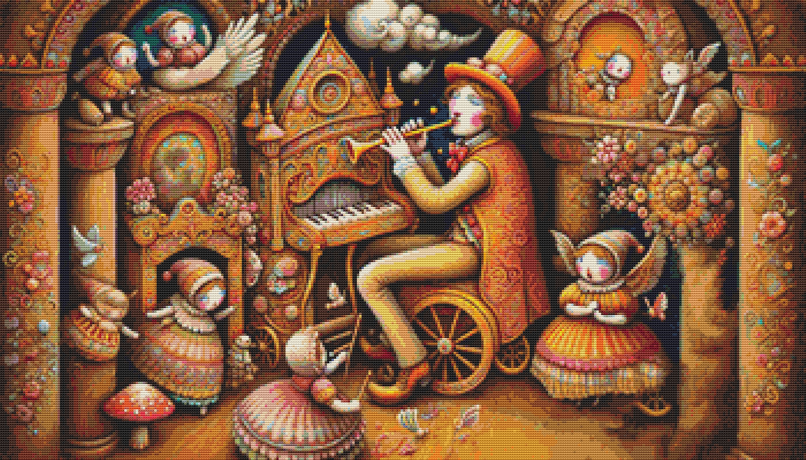 This cross stitch pattern of a musician playing music in a whimsical room.