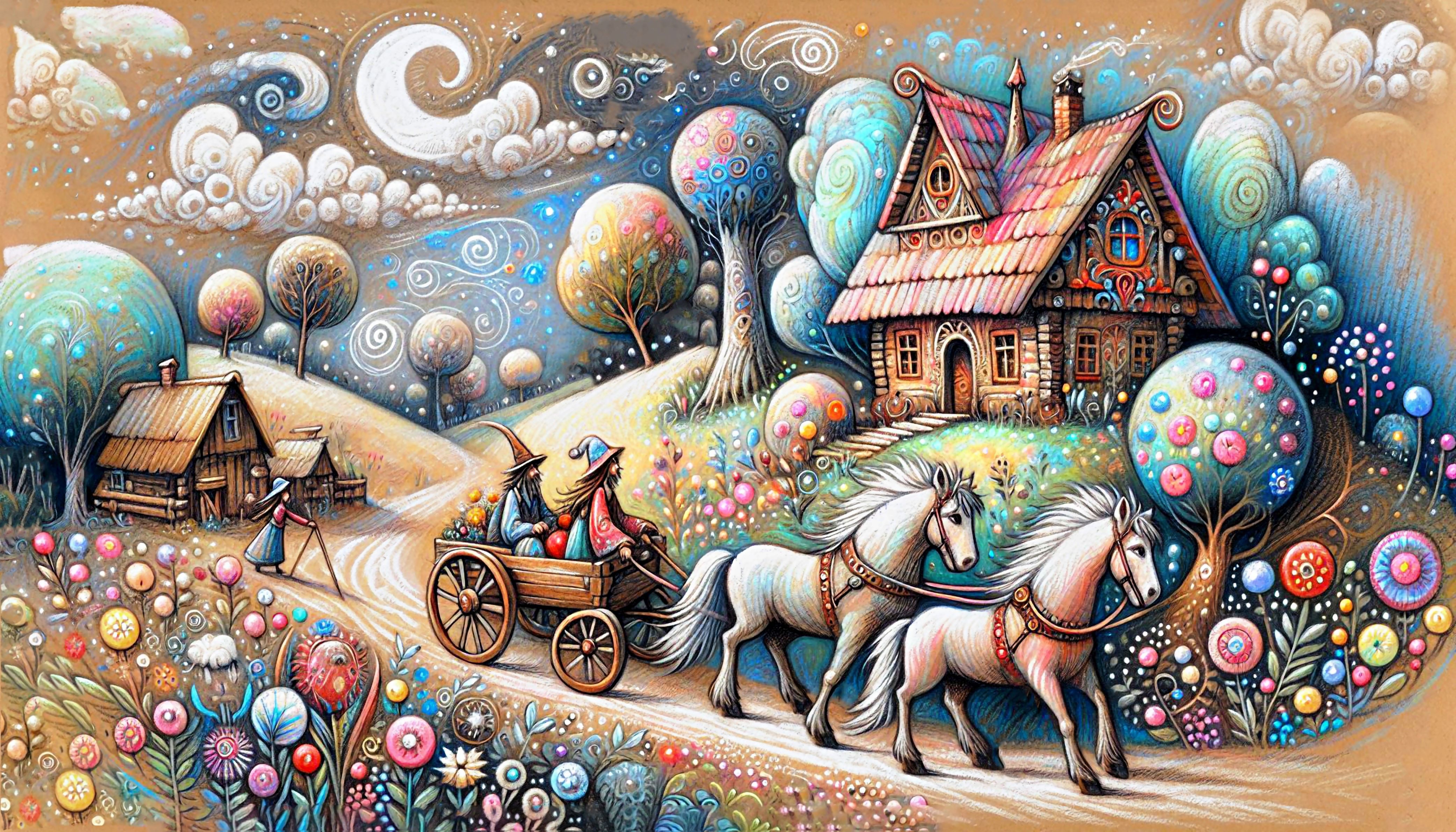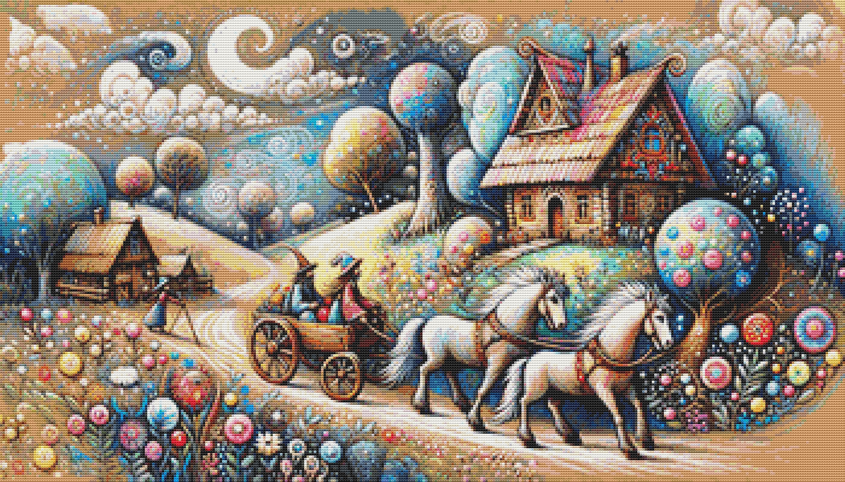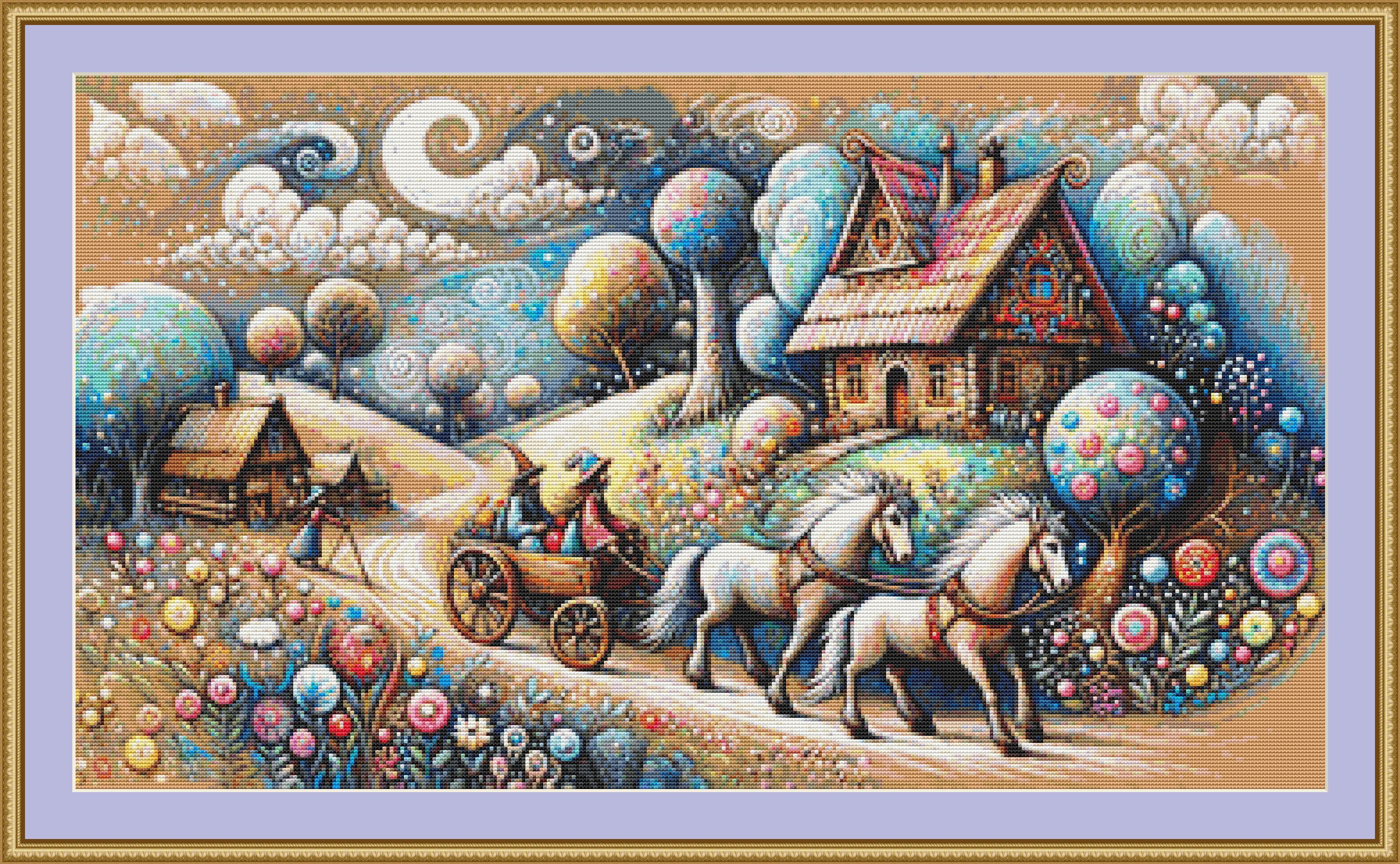 This cross stitch pattern of some whimsical people leaving their farm on a cart with two white horses.