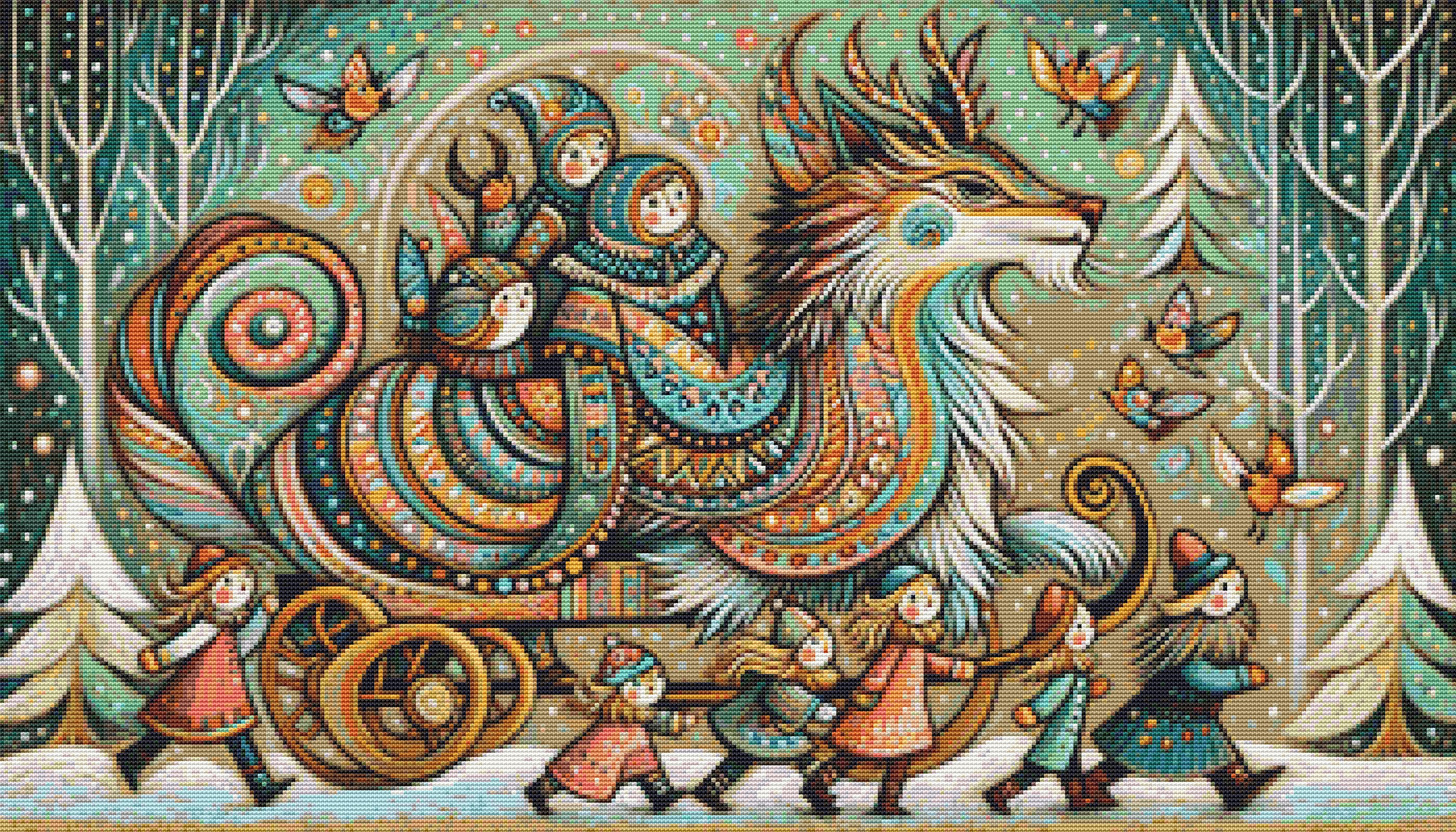 This cross stitch pattern of some children pushing a whimsical creature along on a sledge.