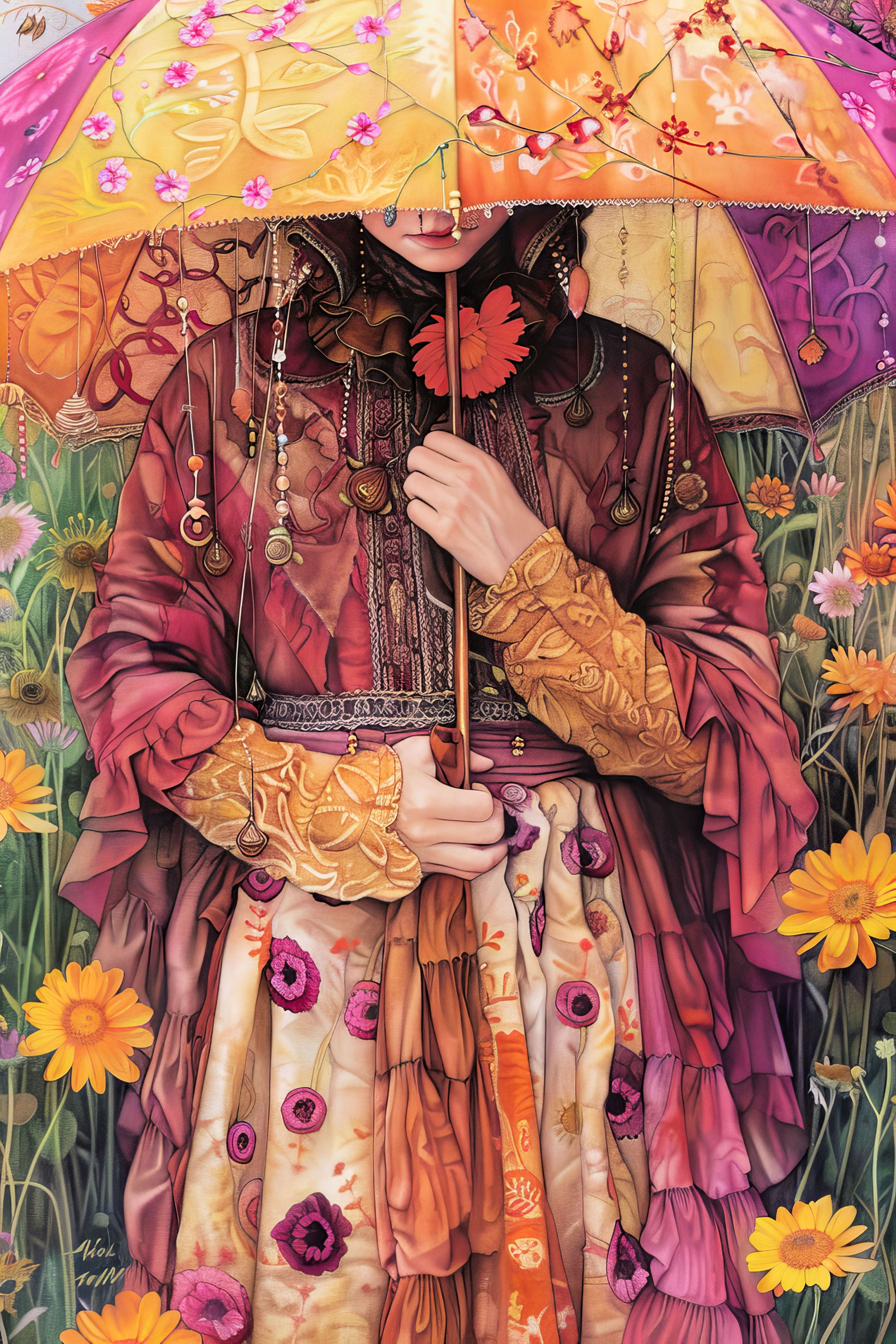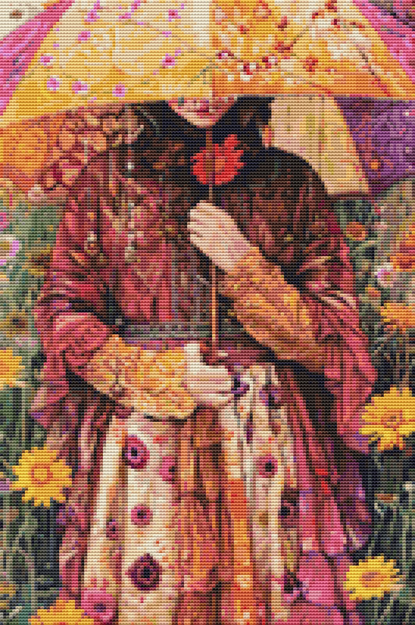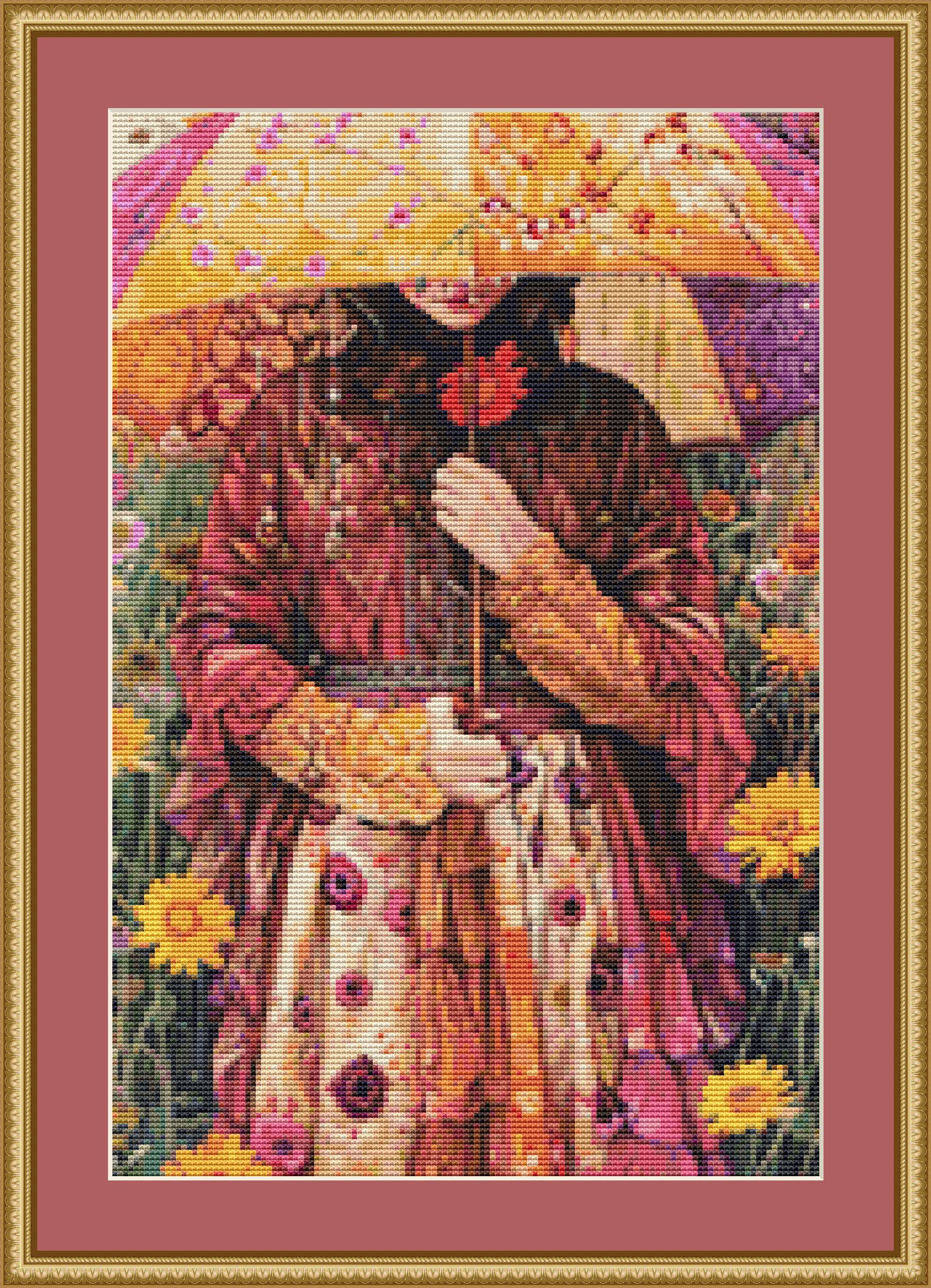 This cross stitch pattern of a woman hiding her face under an umbrella.