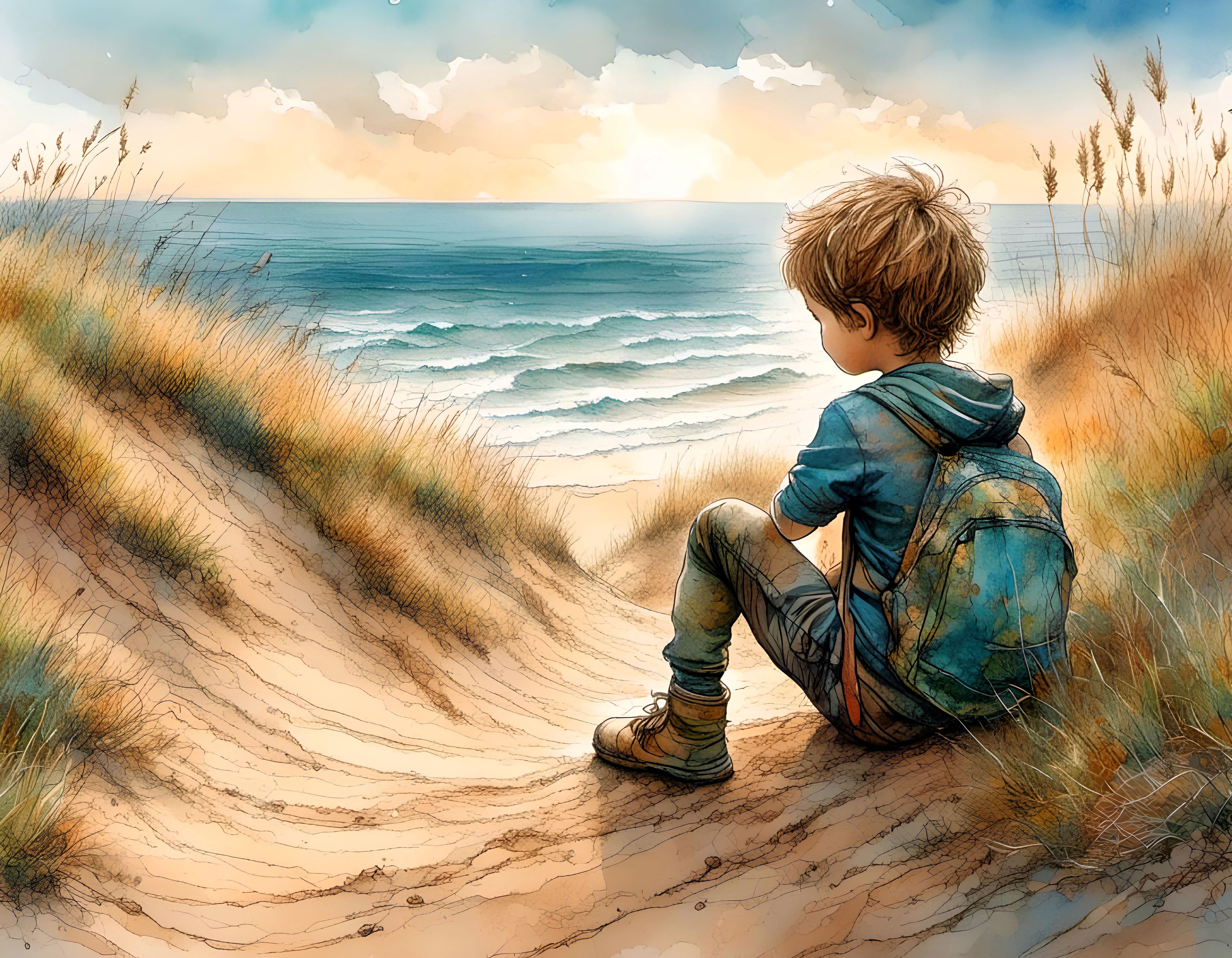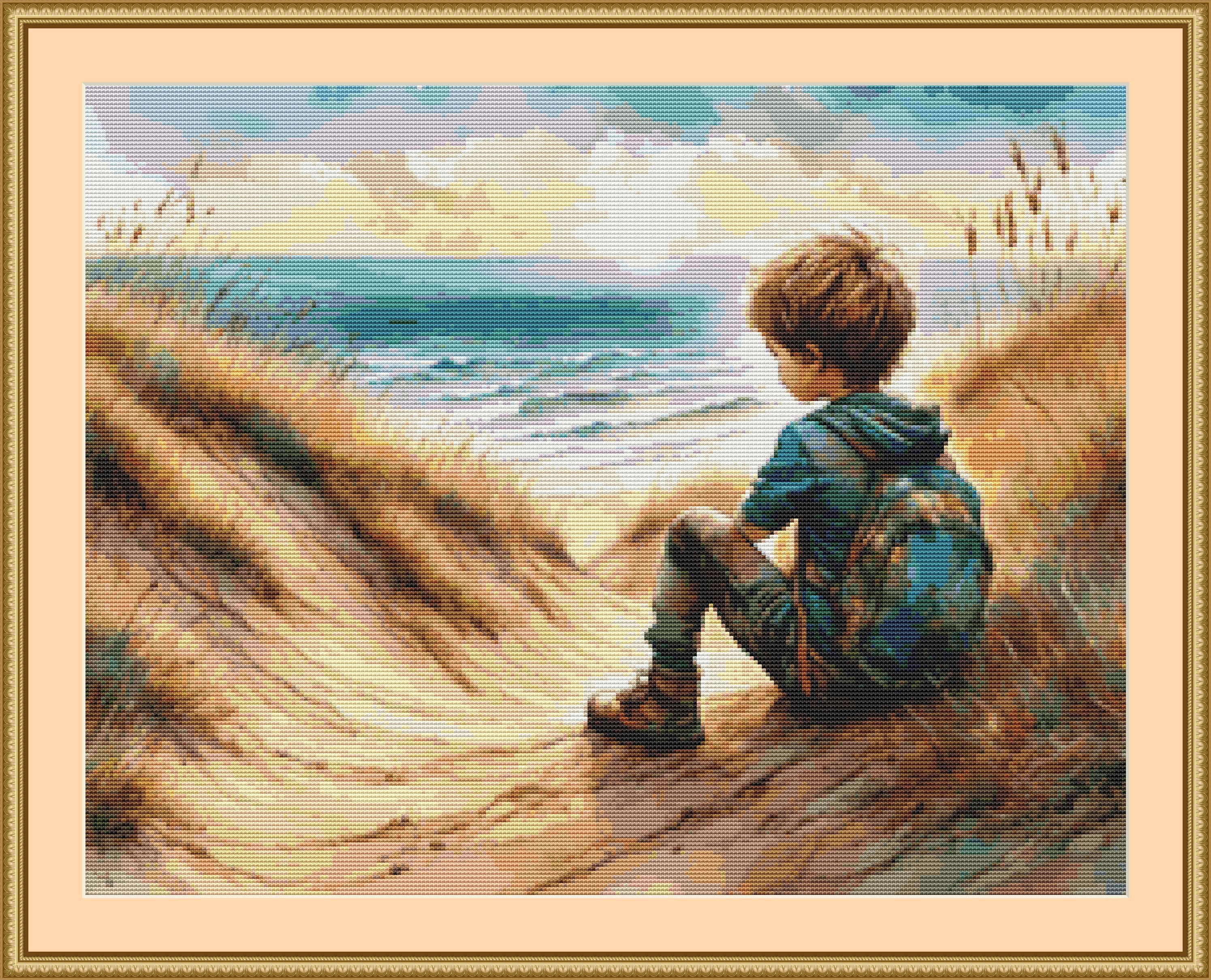 This cross stitch pattern of a young boy sat on the sand dunes while thinking.