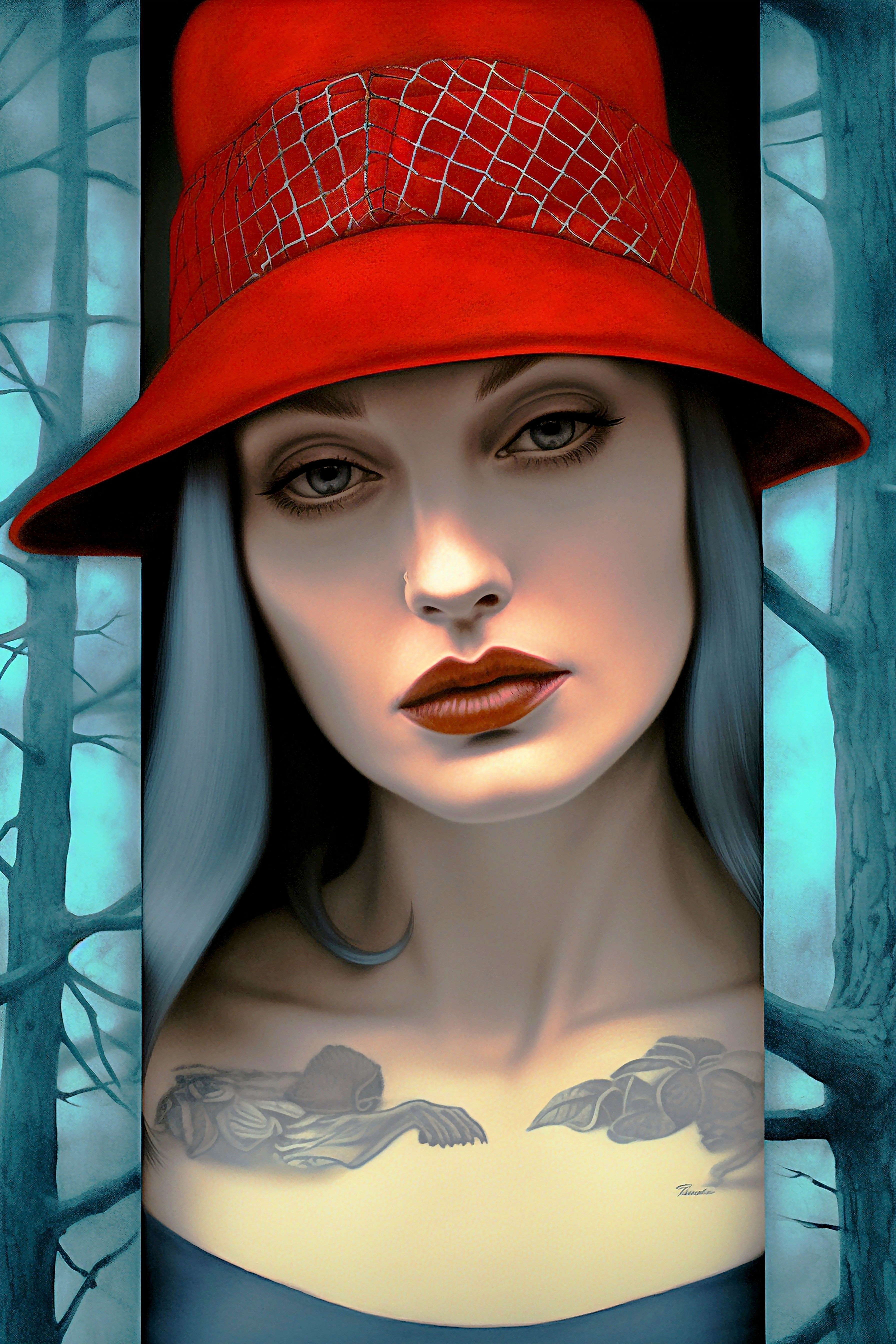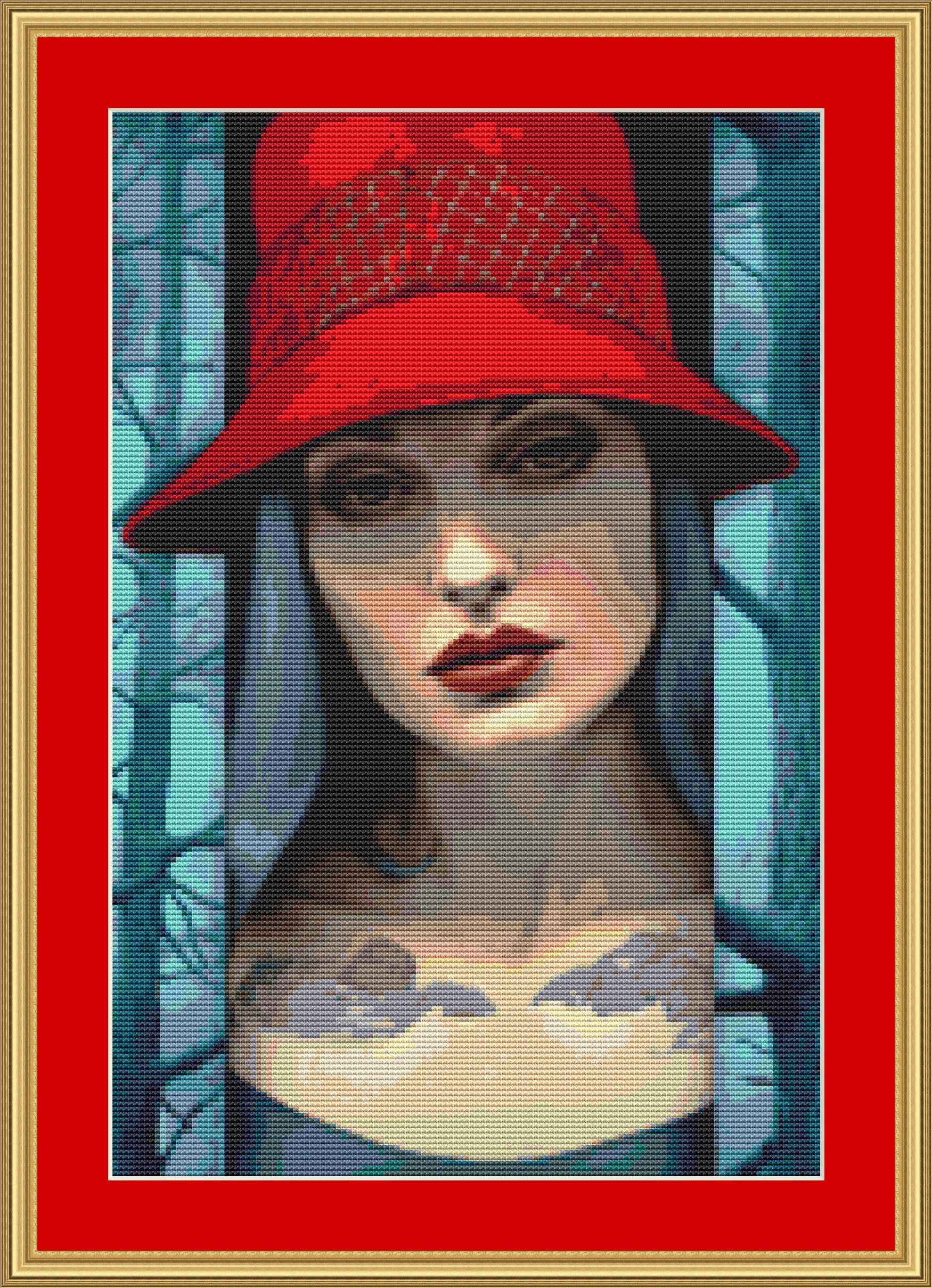 This cross stitch pattern of a woman with two tattoos wearing a red hat.
