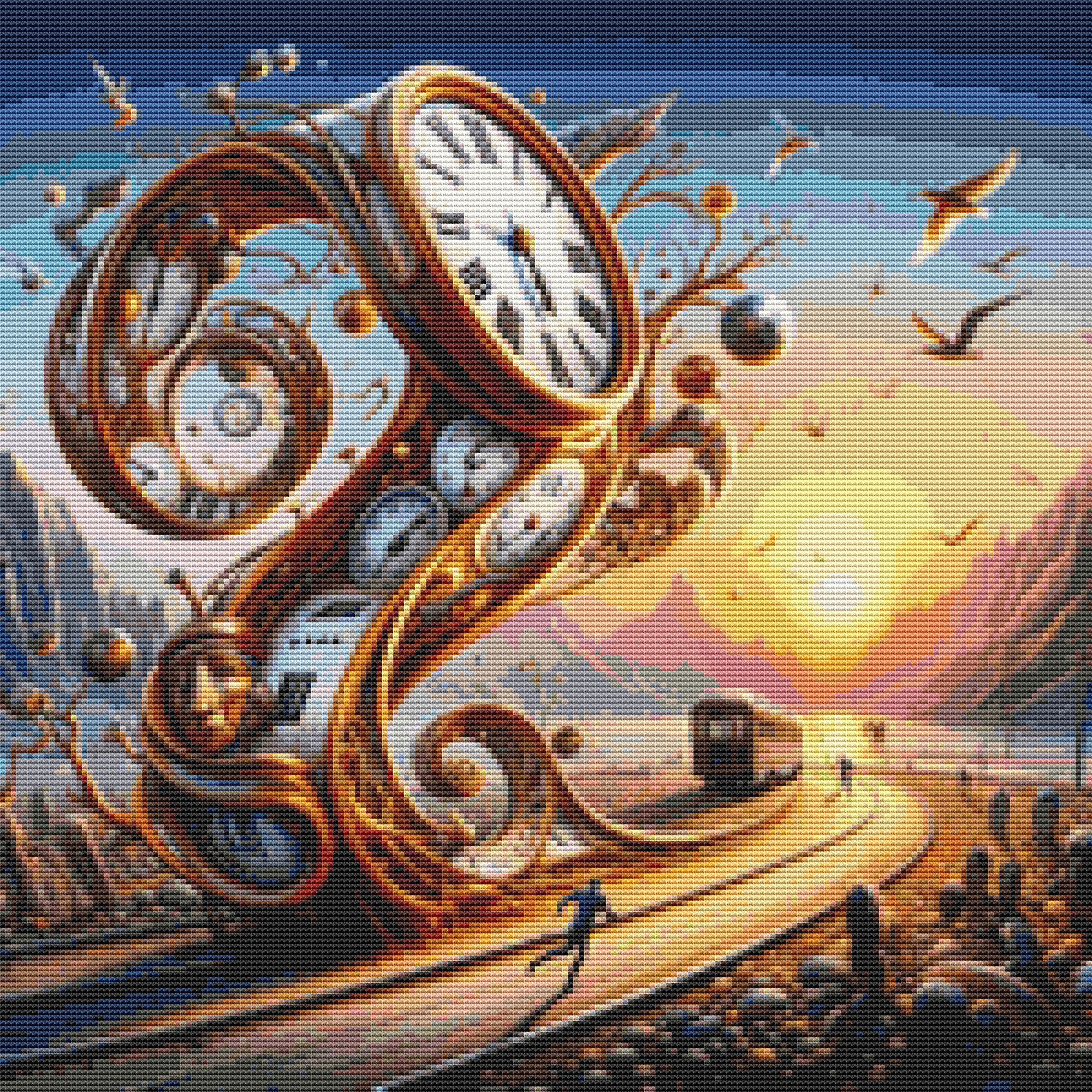 This cross stitch pattern of a surreal image of a formation of clocks.