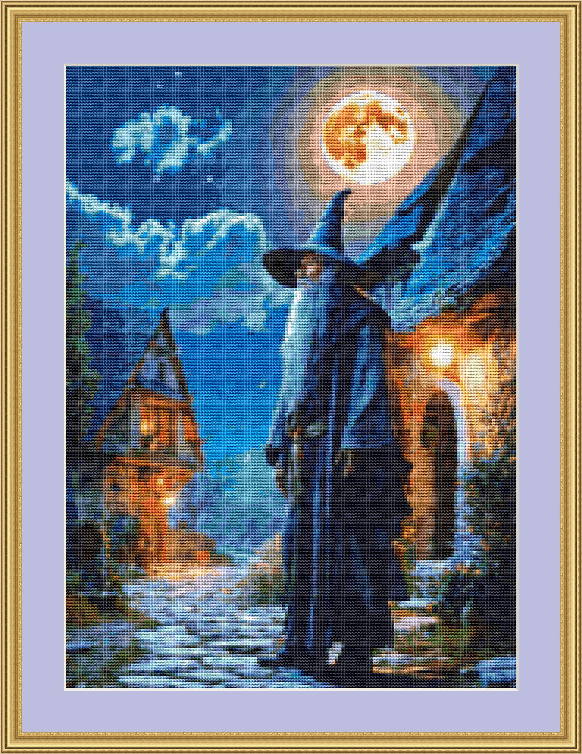 This cross stitch pattern of a sorcerer standing in the moonlight.