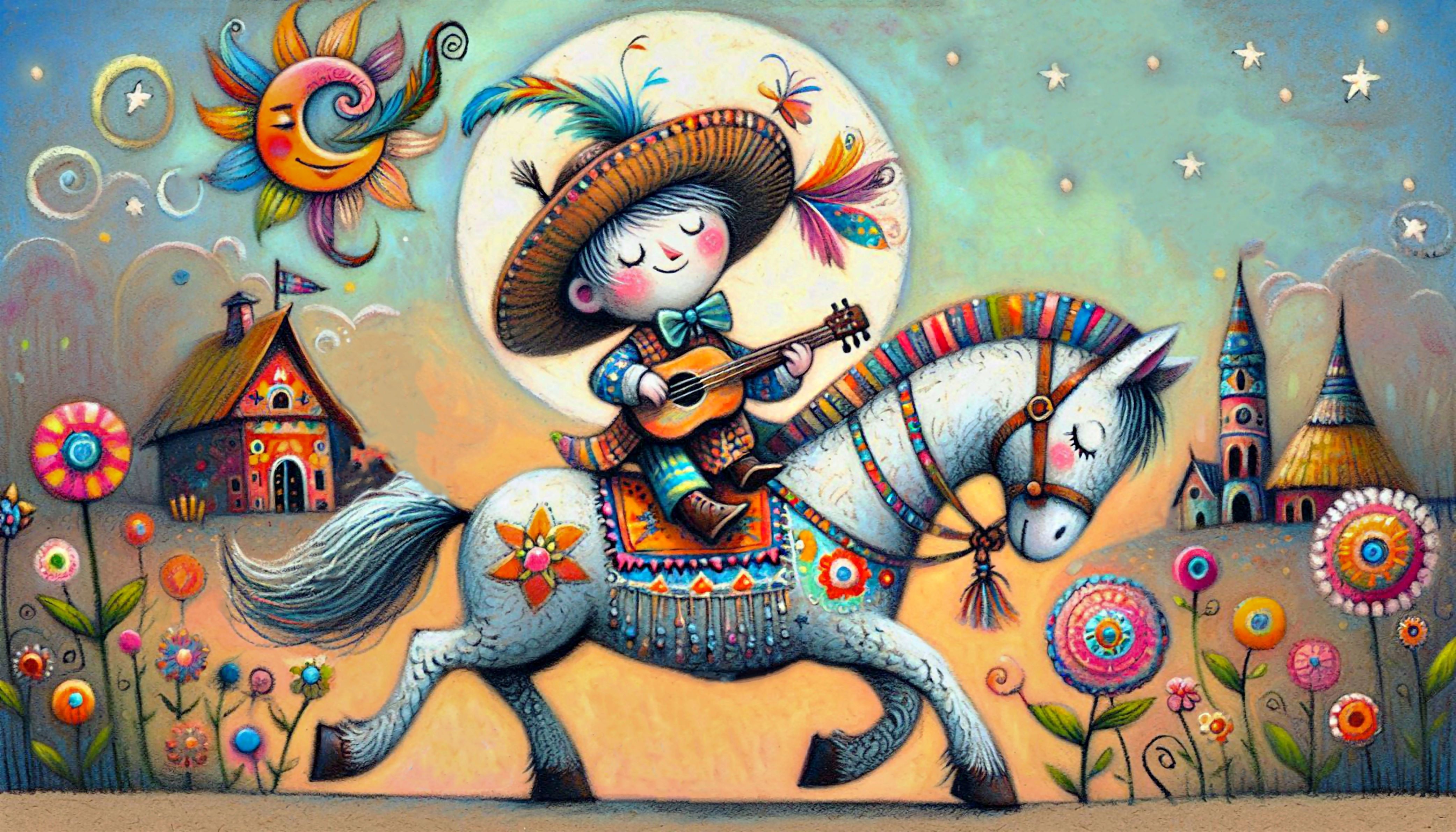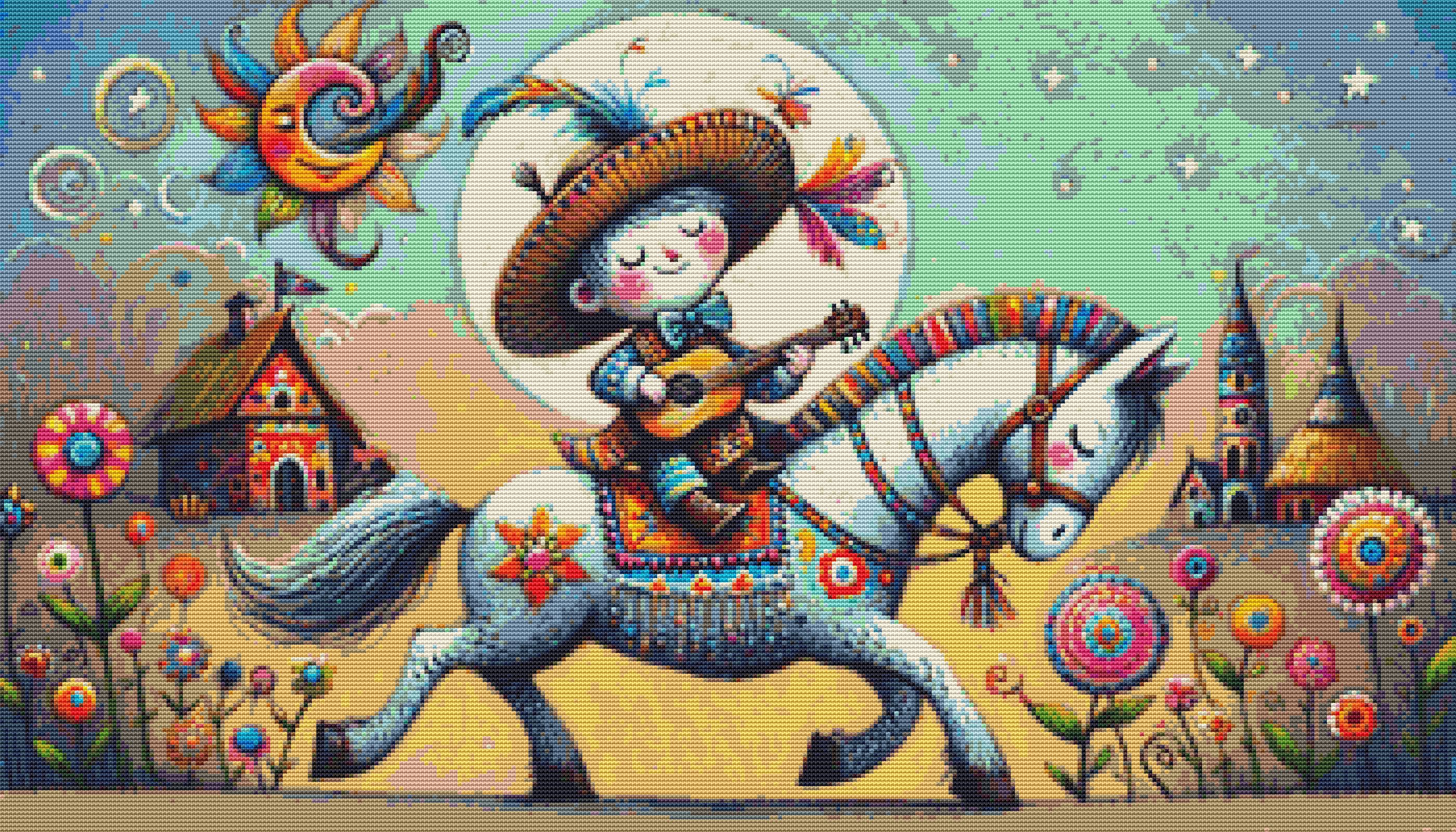 This cross stitch pattern of a cowboy sitting a horse while singing and playing the guitar.
