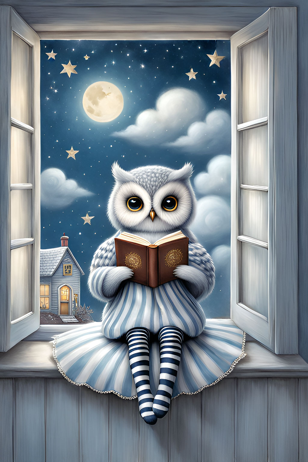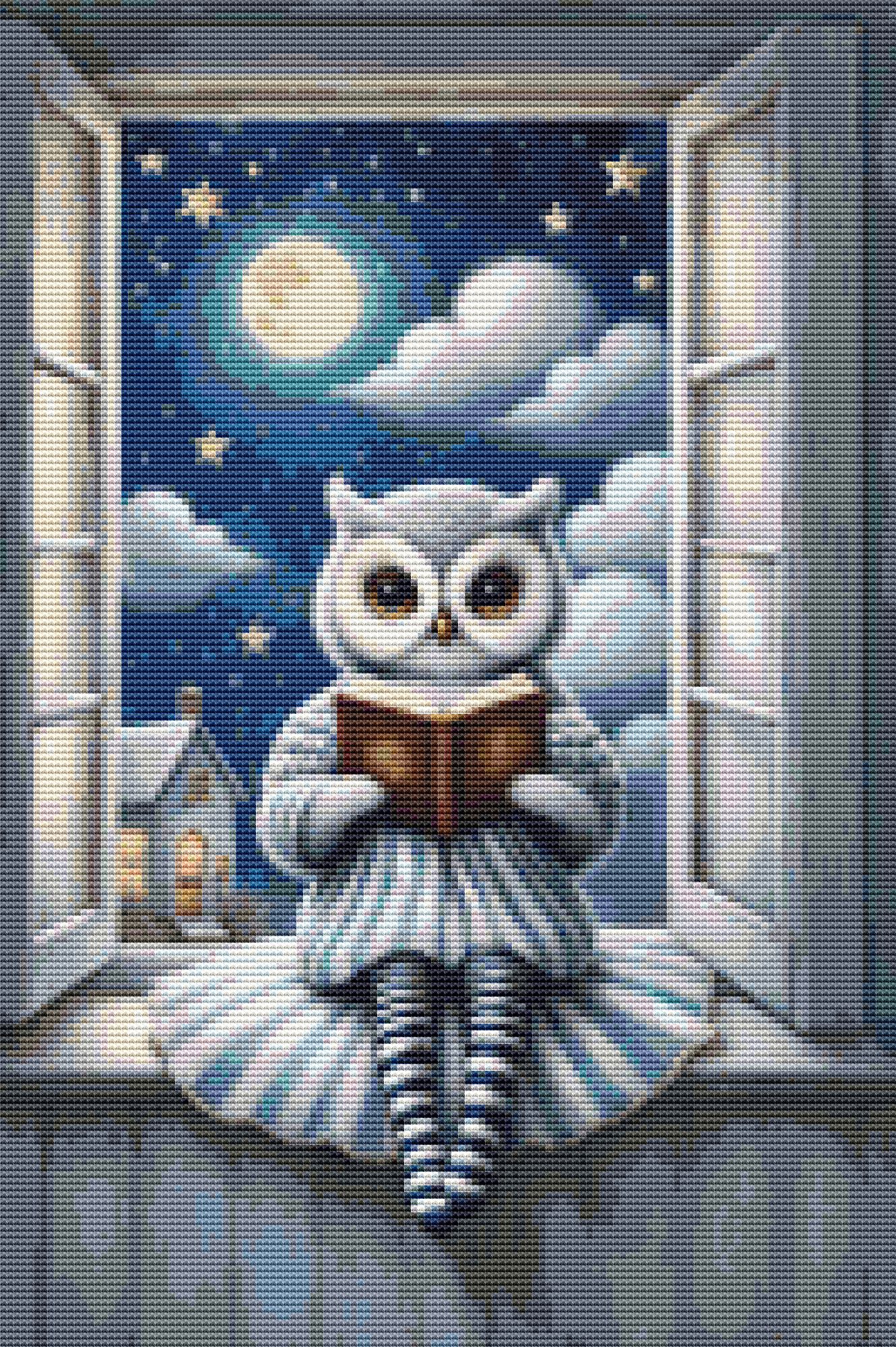 This cross stitch pattern of an owl sitting in a window reading a book.