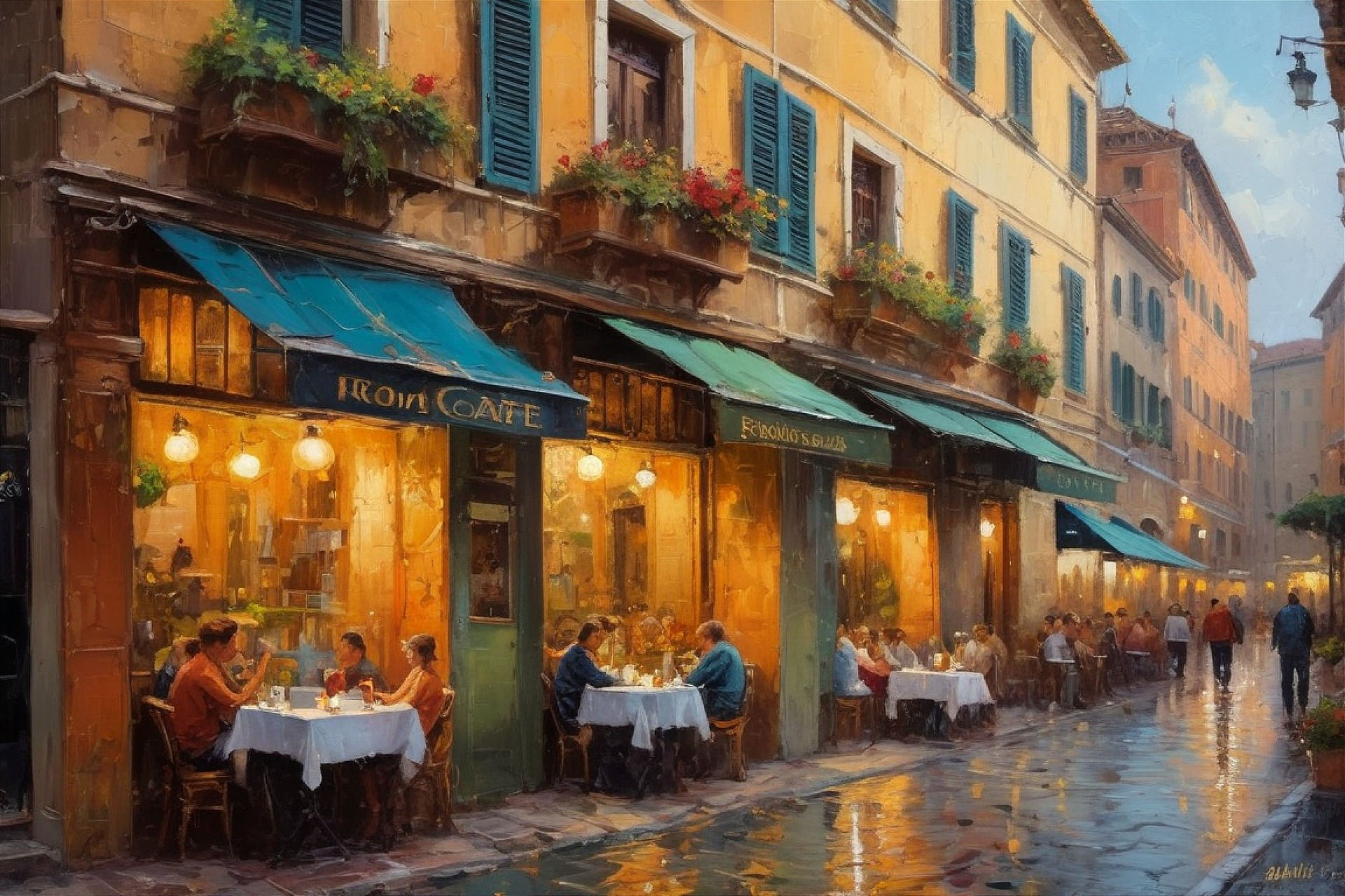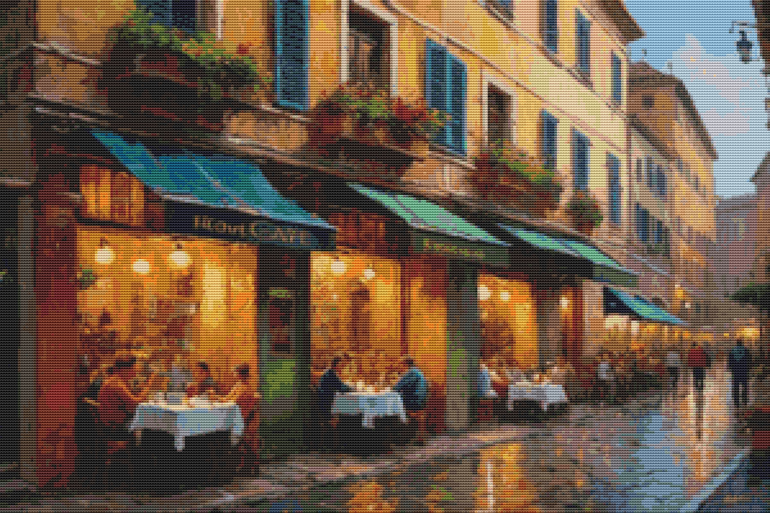 This cross stitch pattern of people dining at the outside of a restaurant on a wet evening.