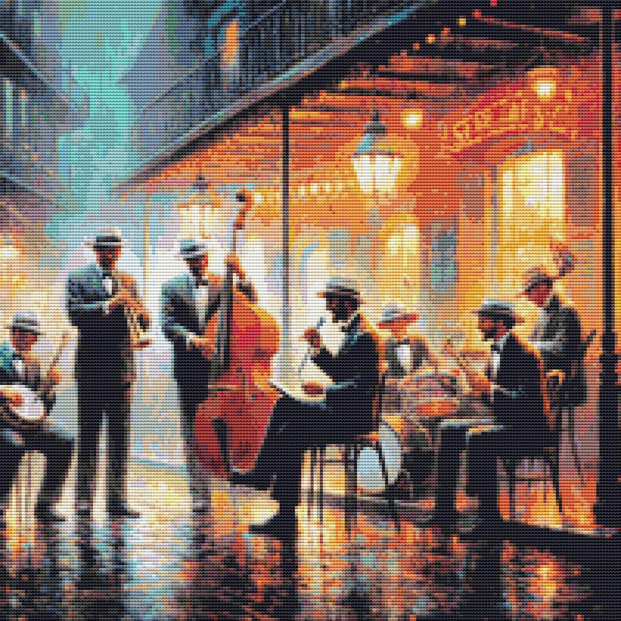 This cross stitch pattern of a group of jazz musicians playing in the street.