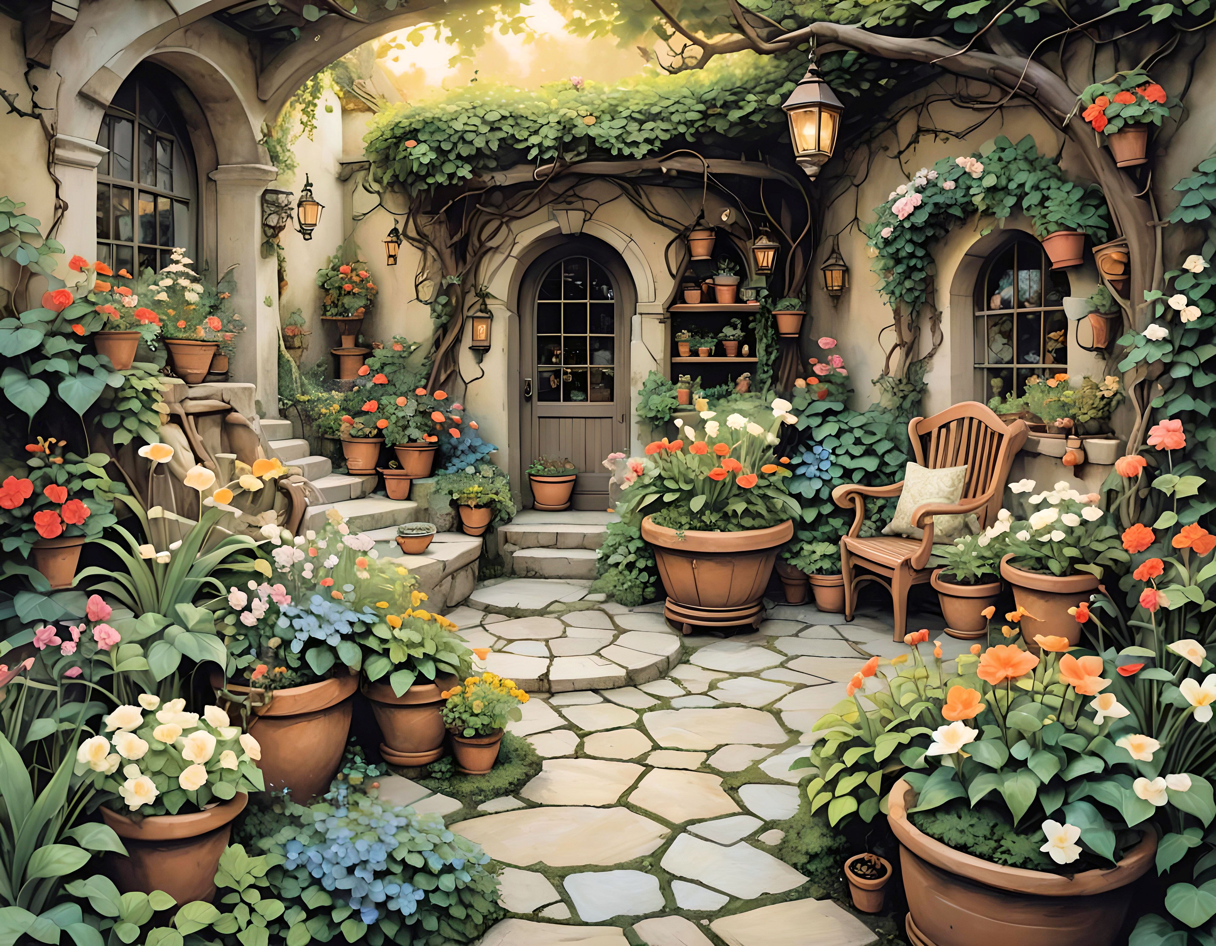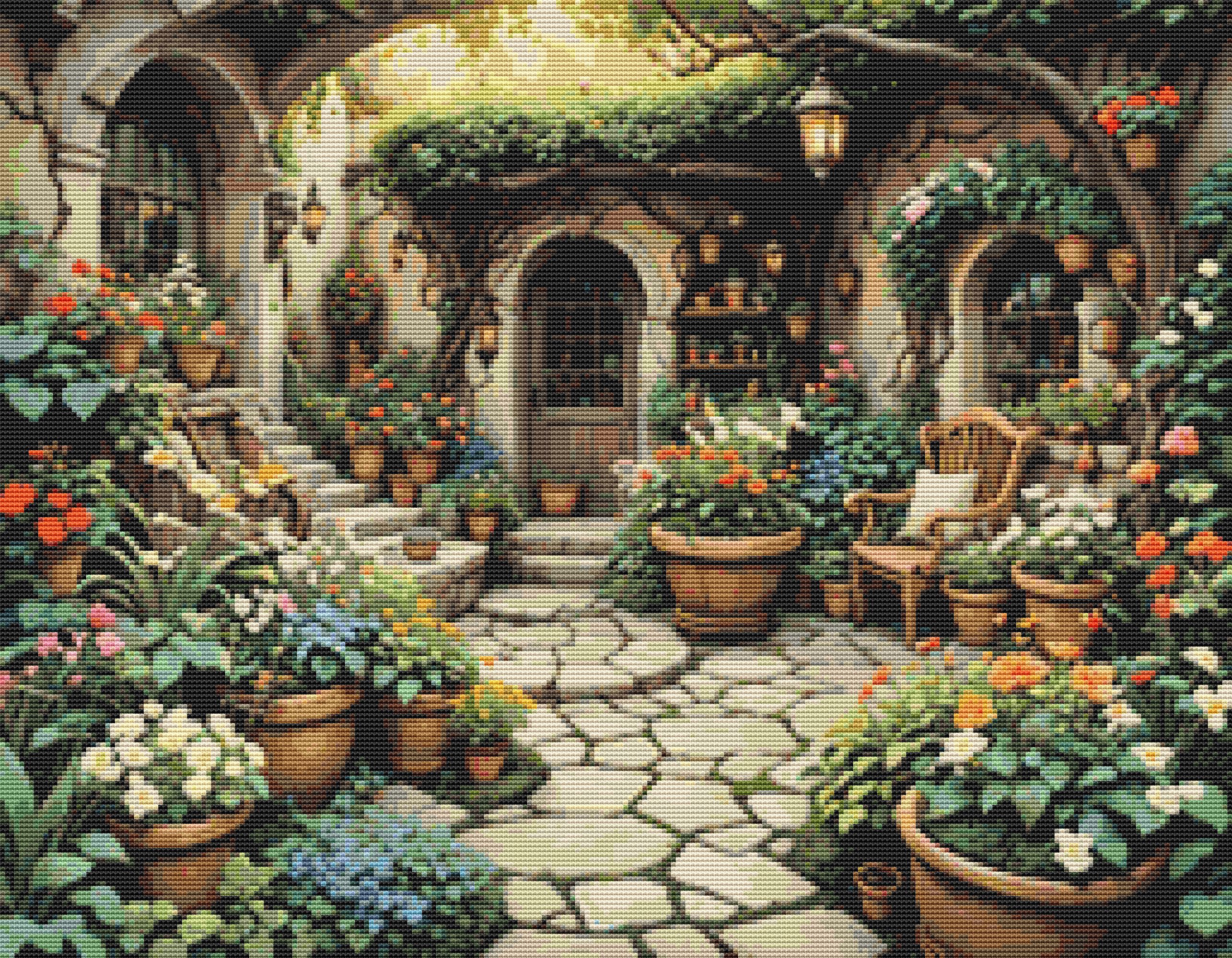 This cross stitch pattern of a quaint courtyard garden full of flowers.