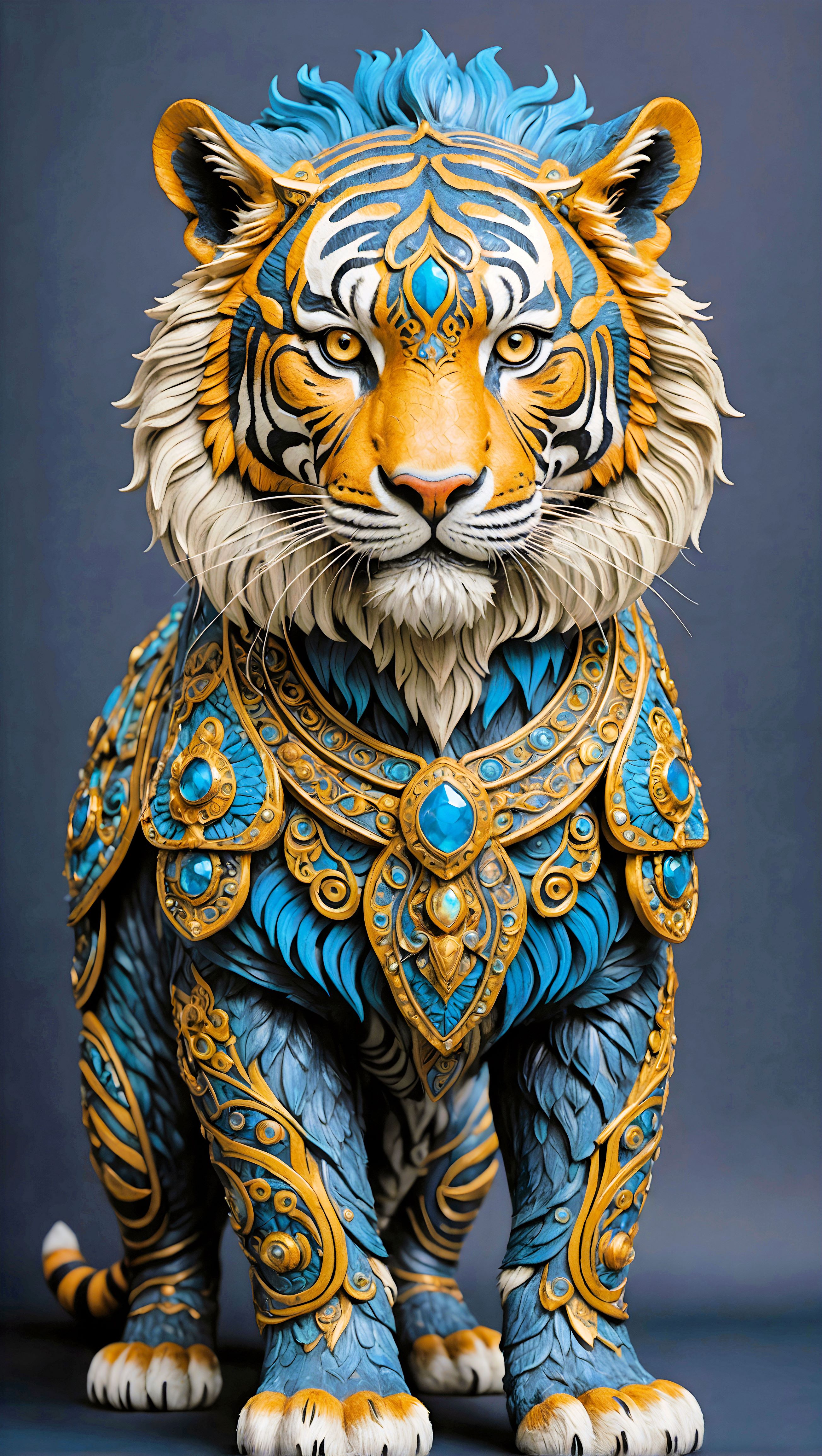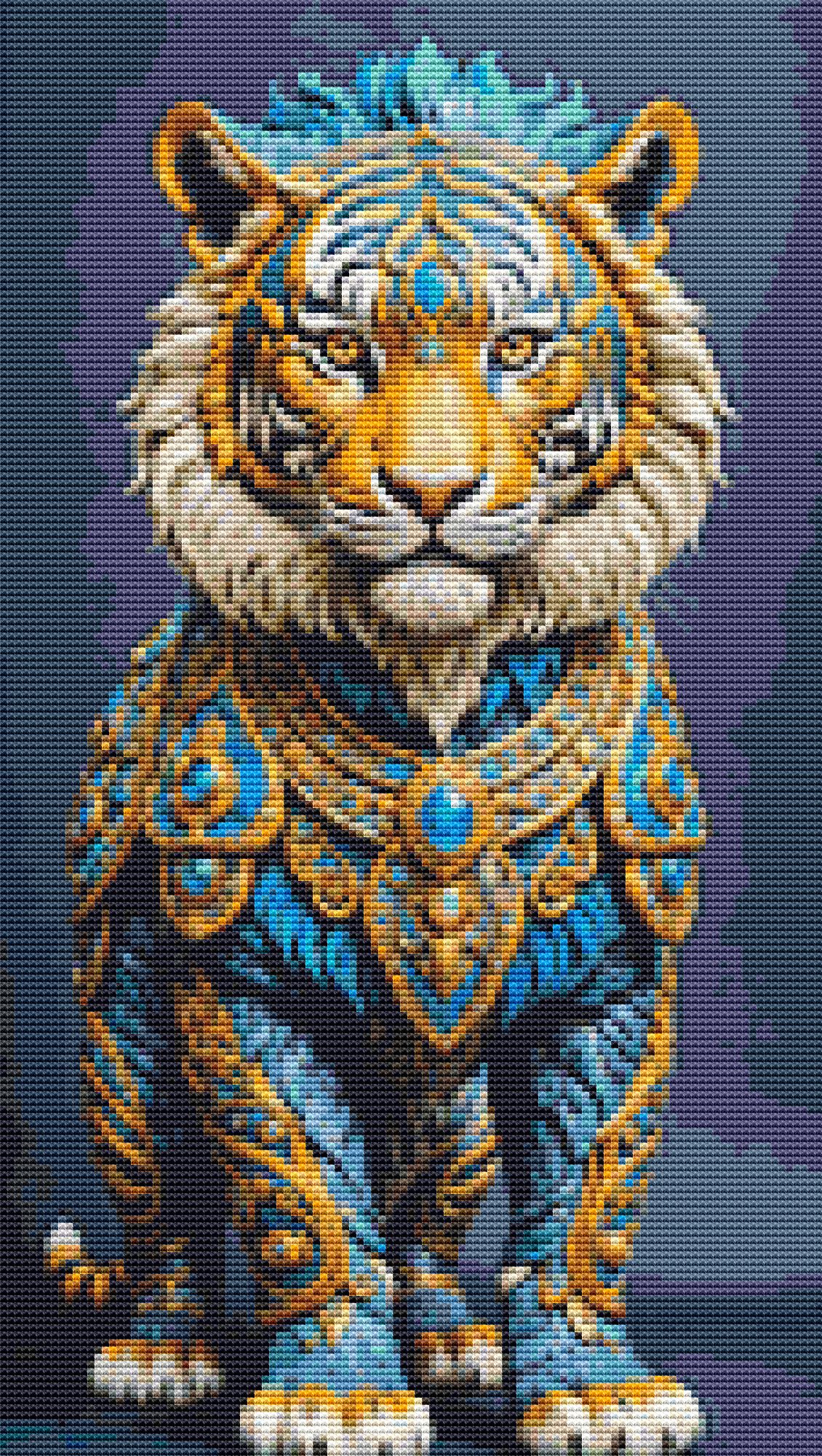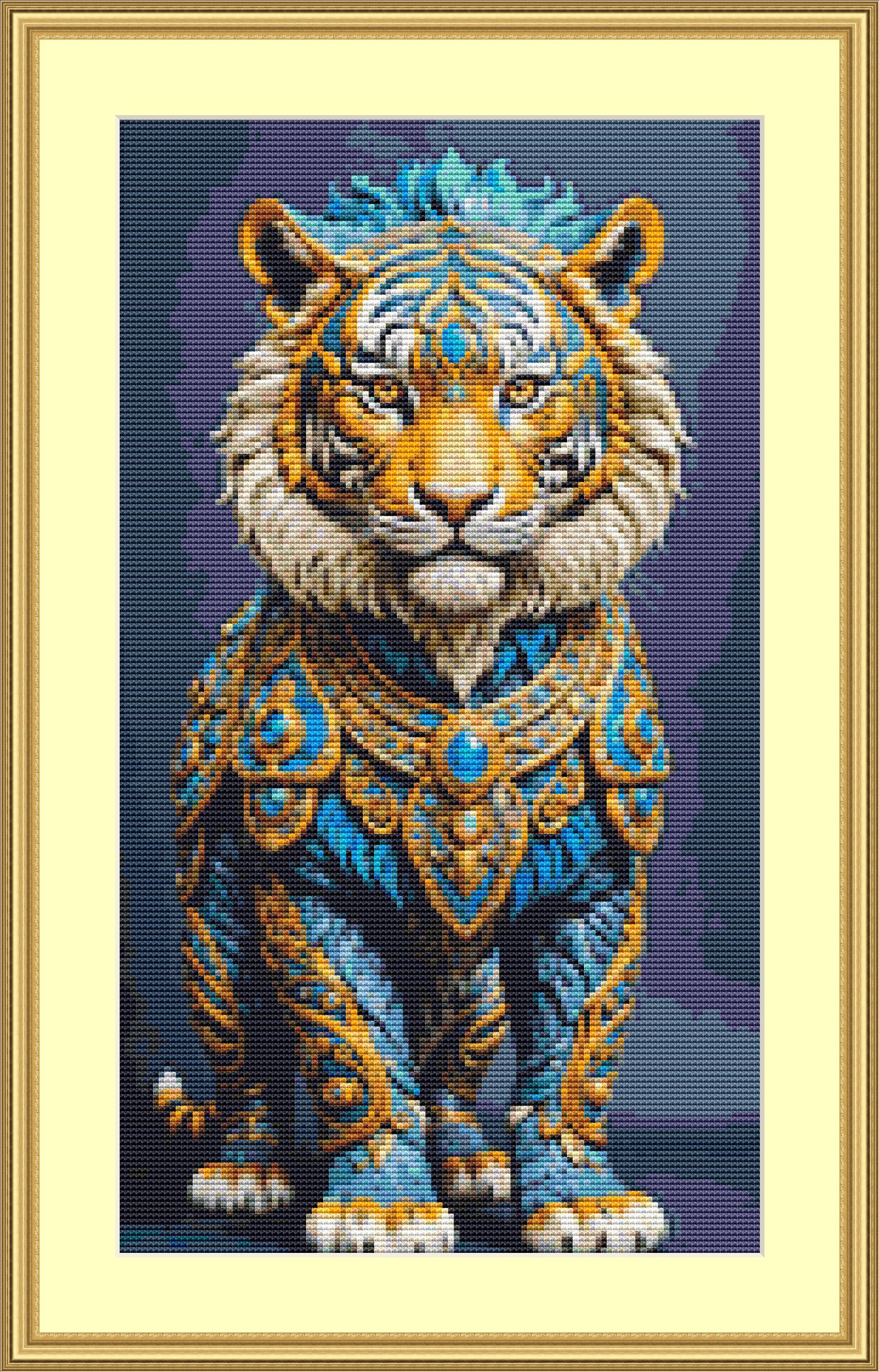 This cross stitch pattern of a beautiful blue tiger with gold gilding.