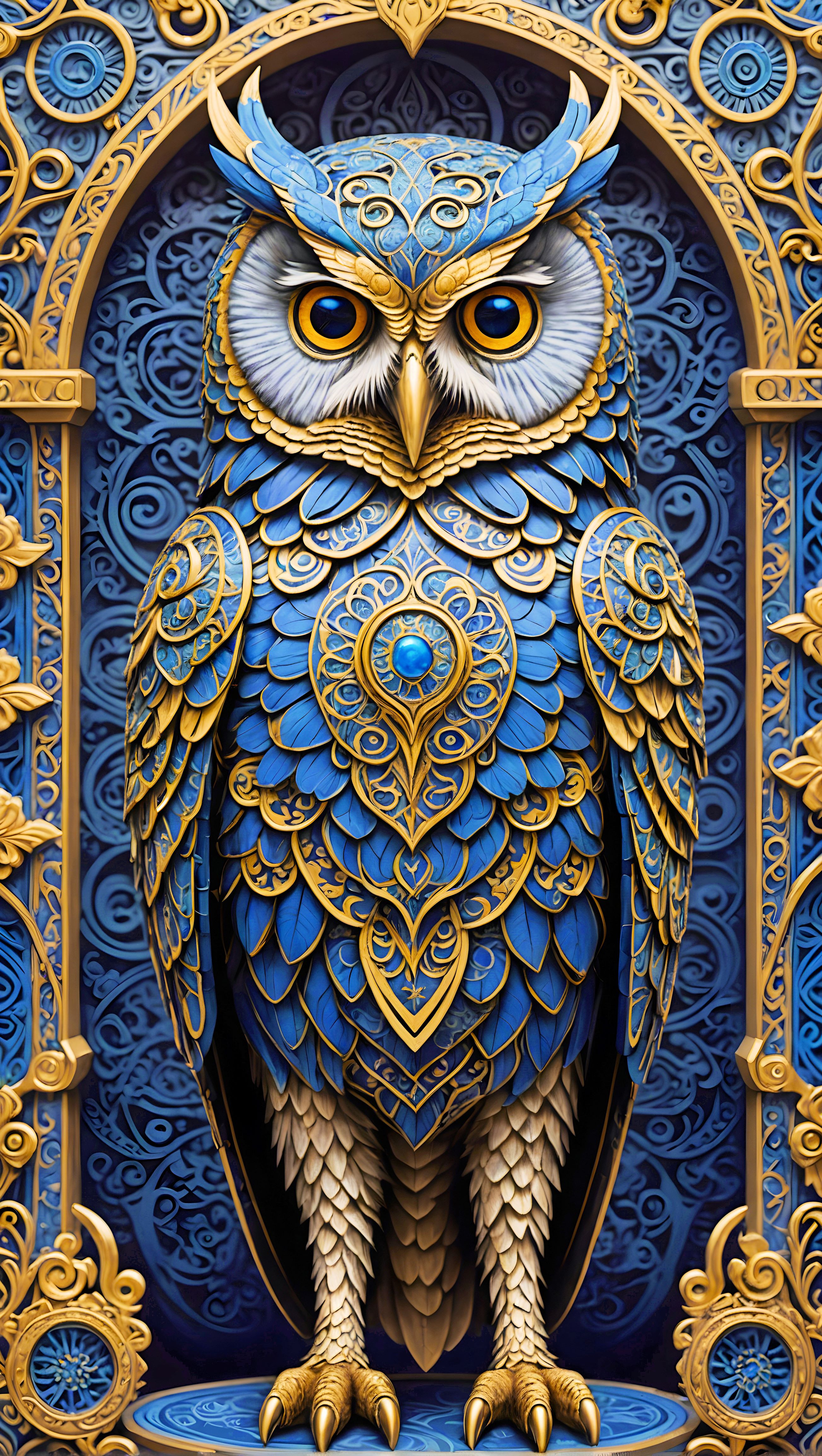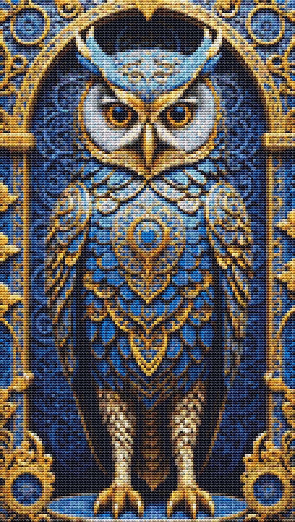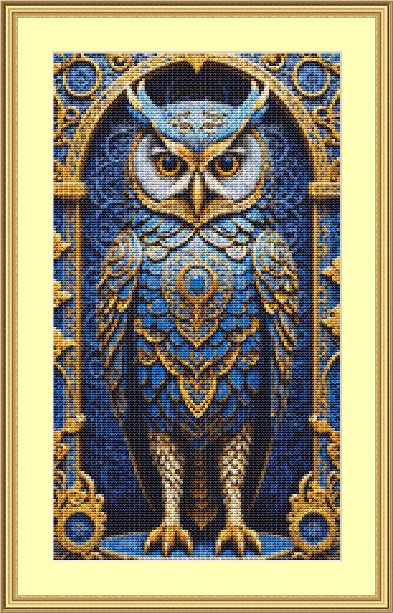 This cross stitch pattern of a beautiful blue owl with gold gilding.