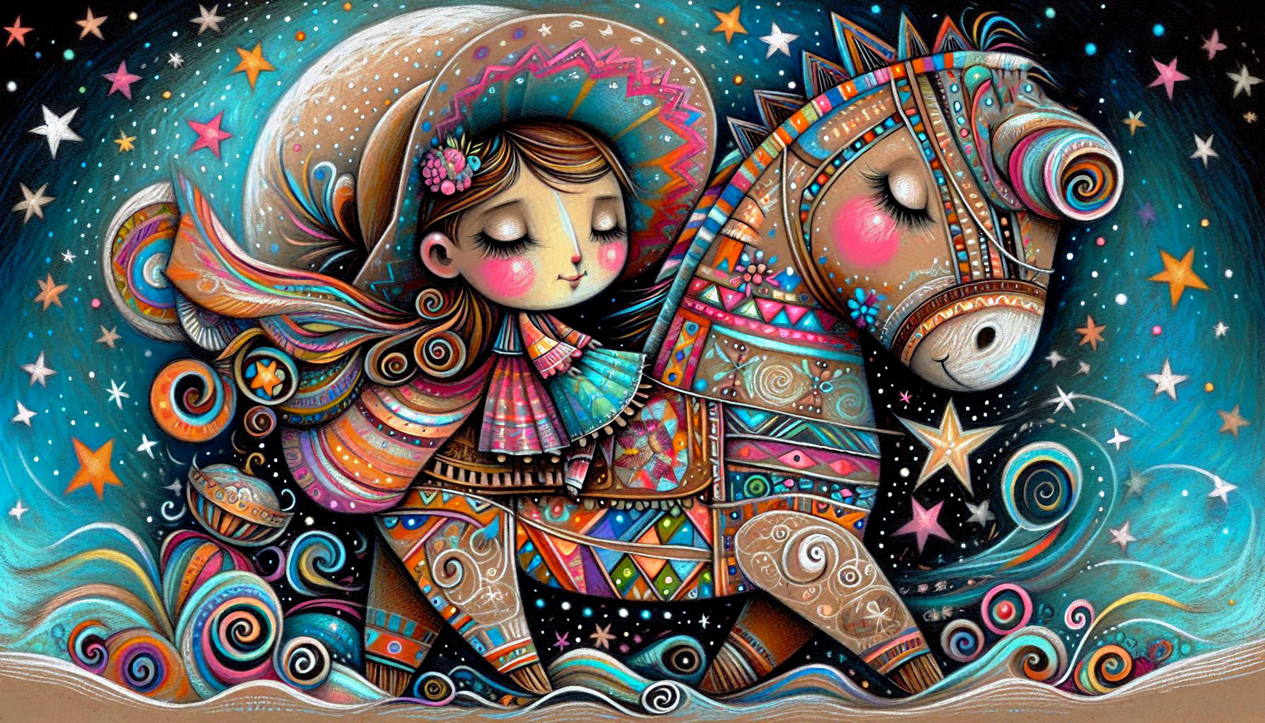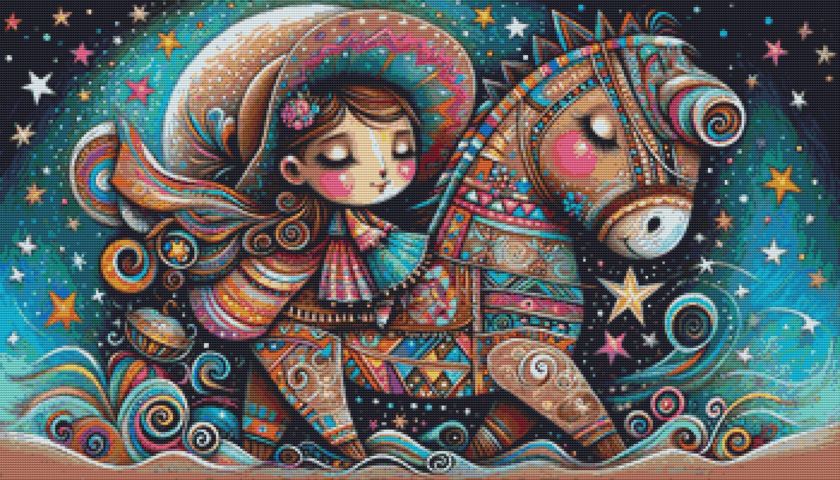 This cross stitch pattern of a young girl sat on a beautiful horse.