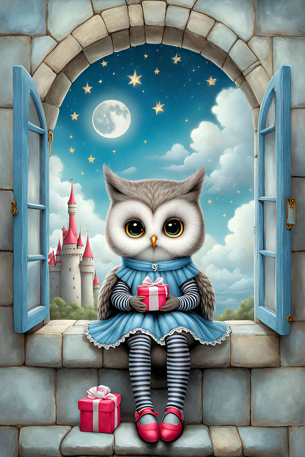 This cross stitch pattern of an owl with some gifts in red boxes.