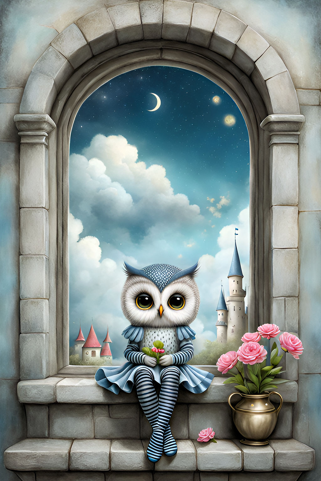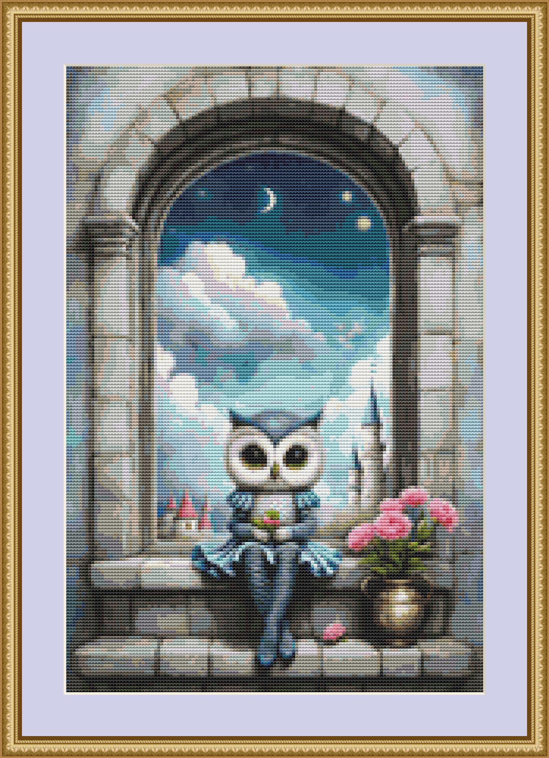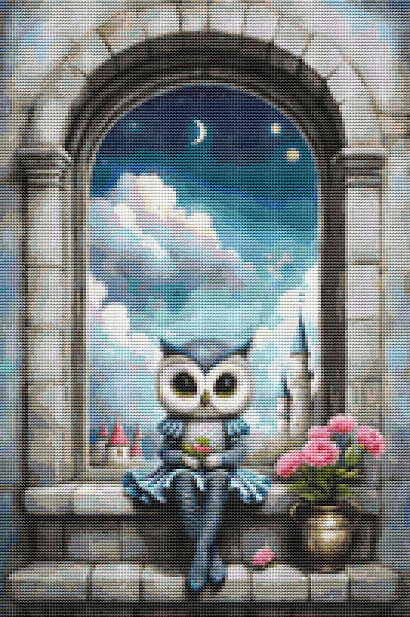 This cross stitch pattern of an owl sat next to some pretty flowers.
