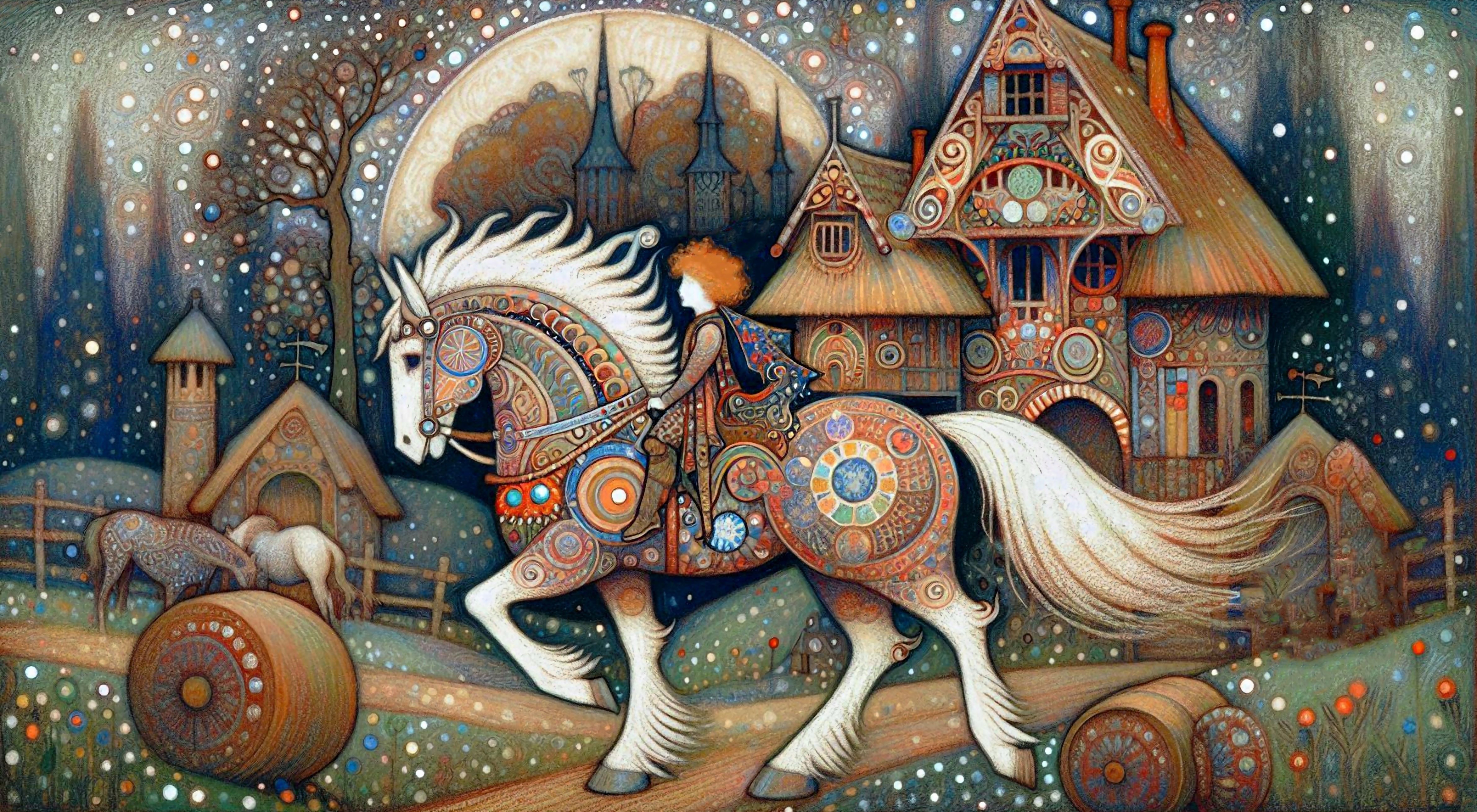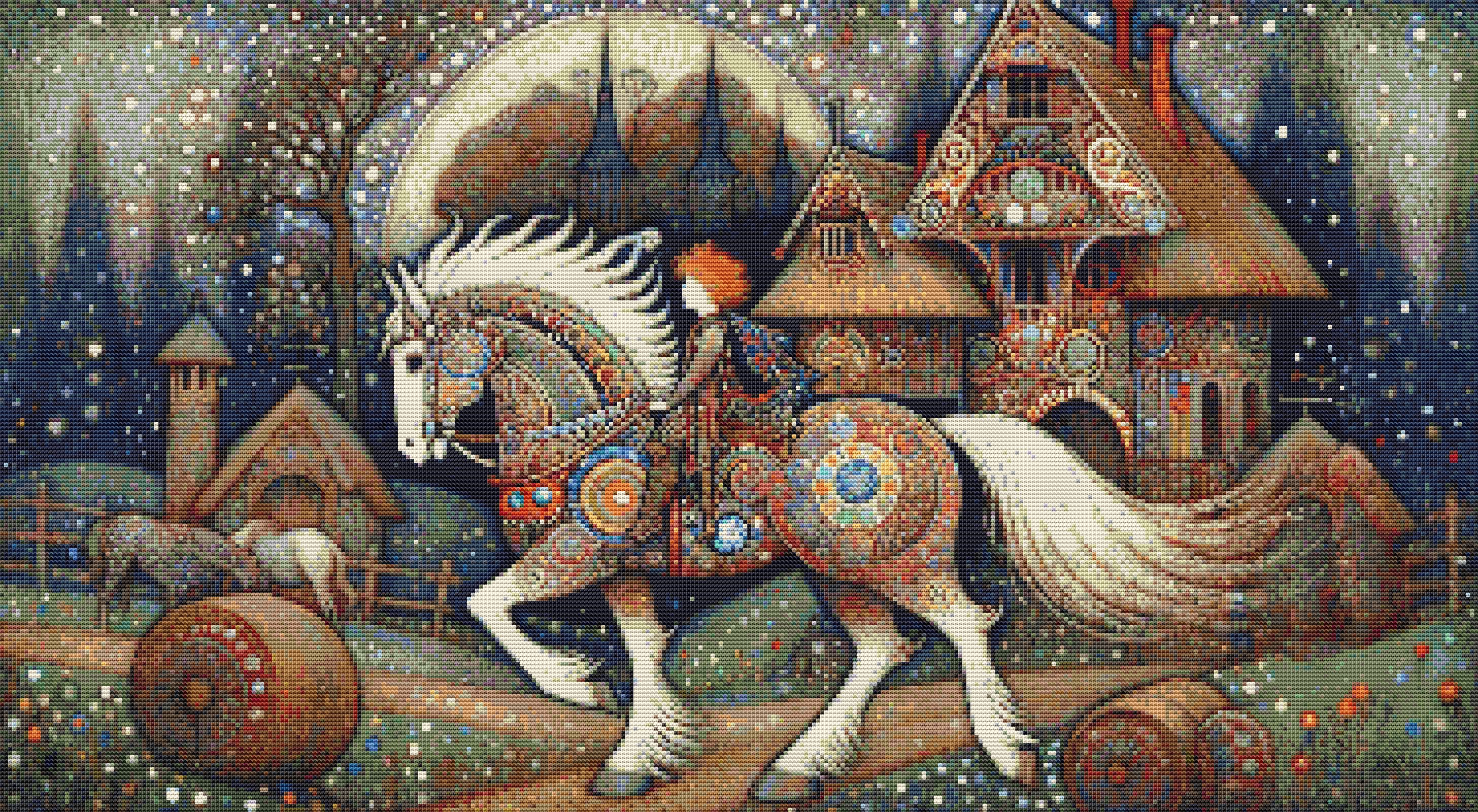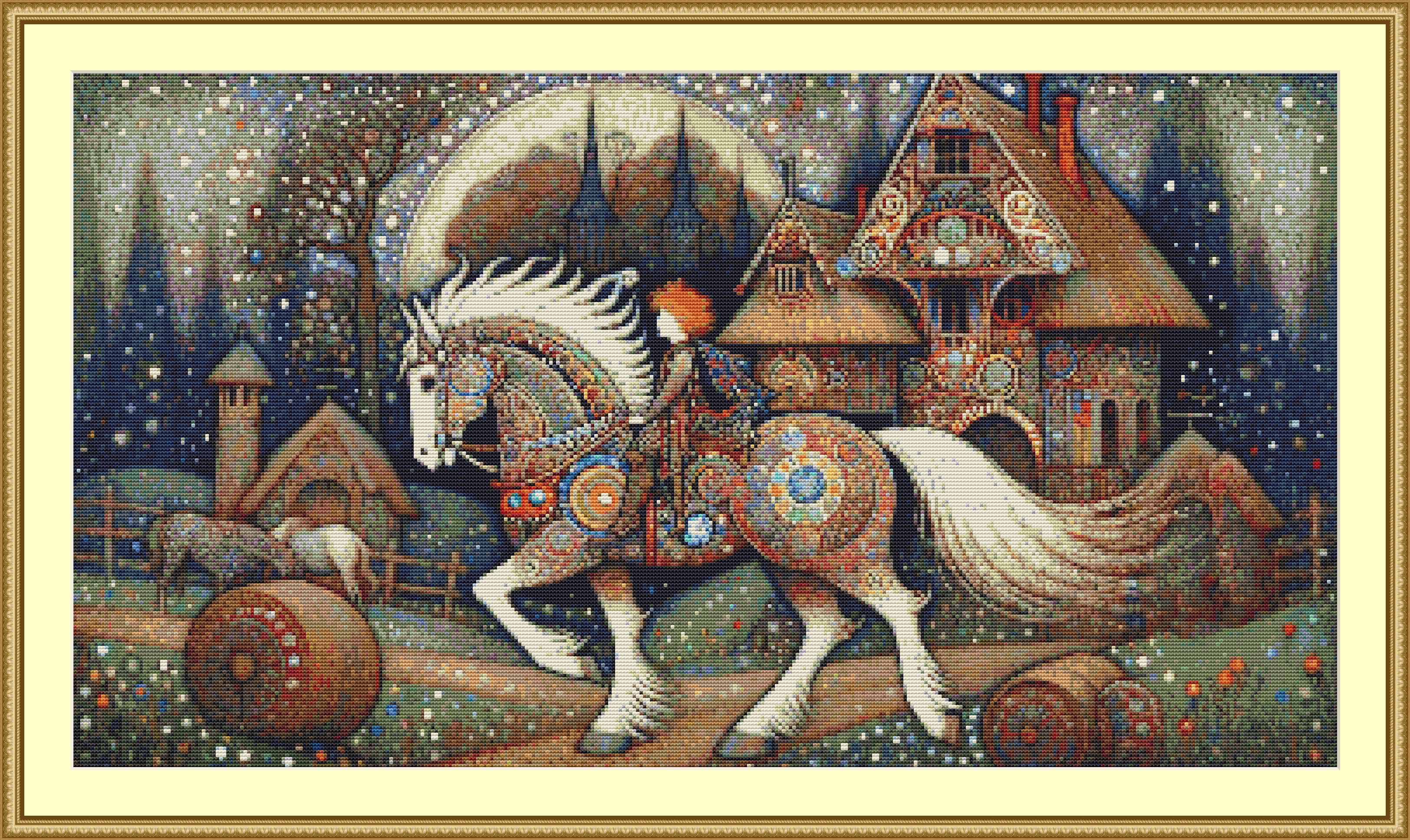 This cross stitch pattern of a boy riding a beautiful fantasy horse.