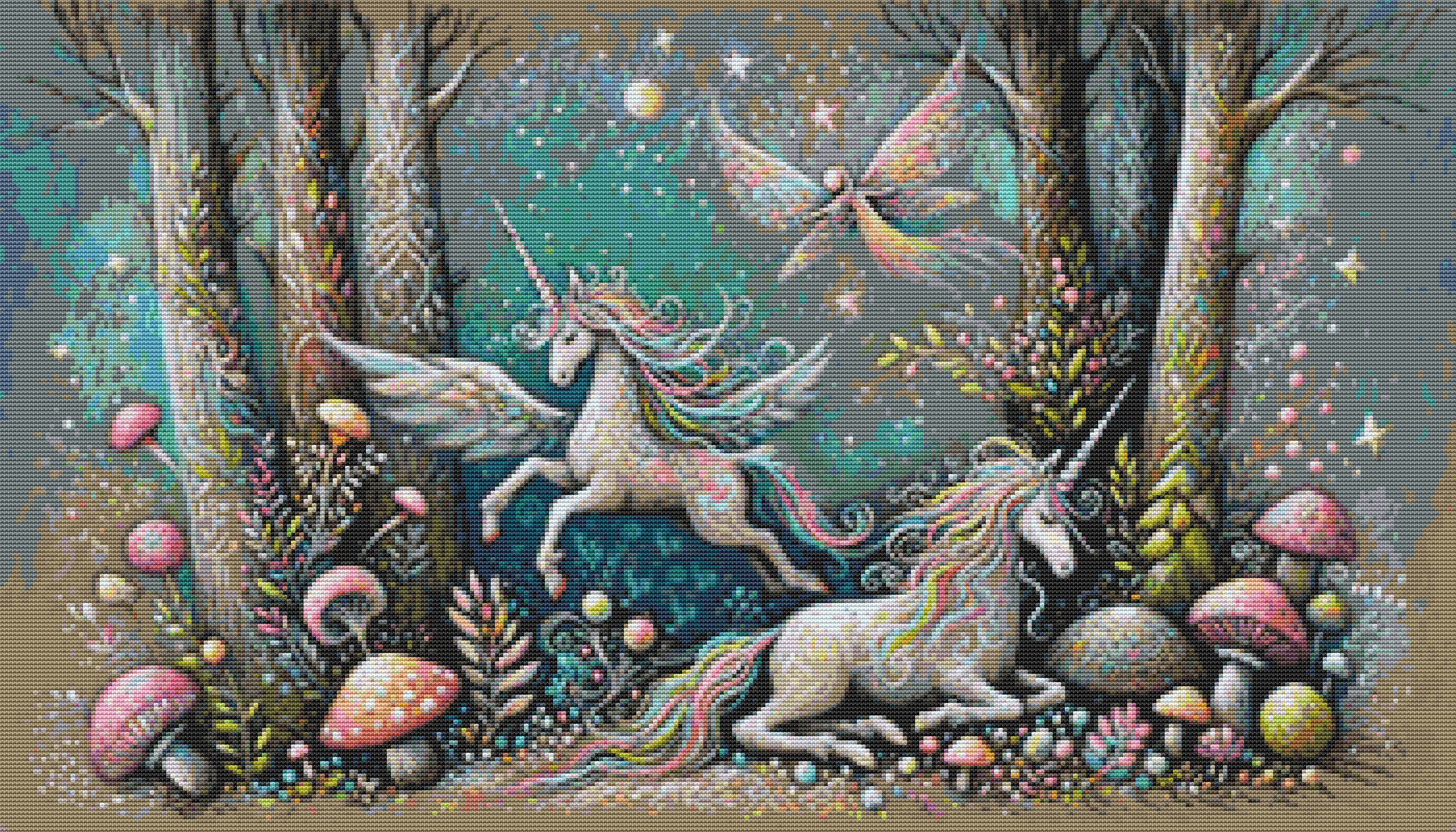 This cross stitch pattern of some beautiful mythical unicorns in a forest.