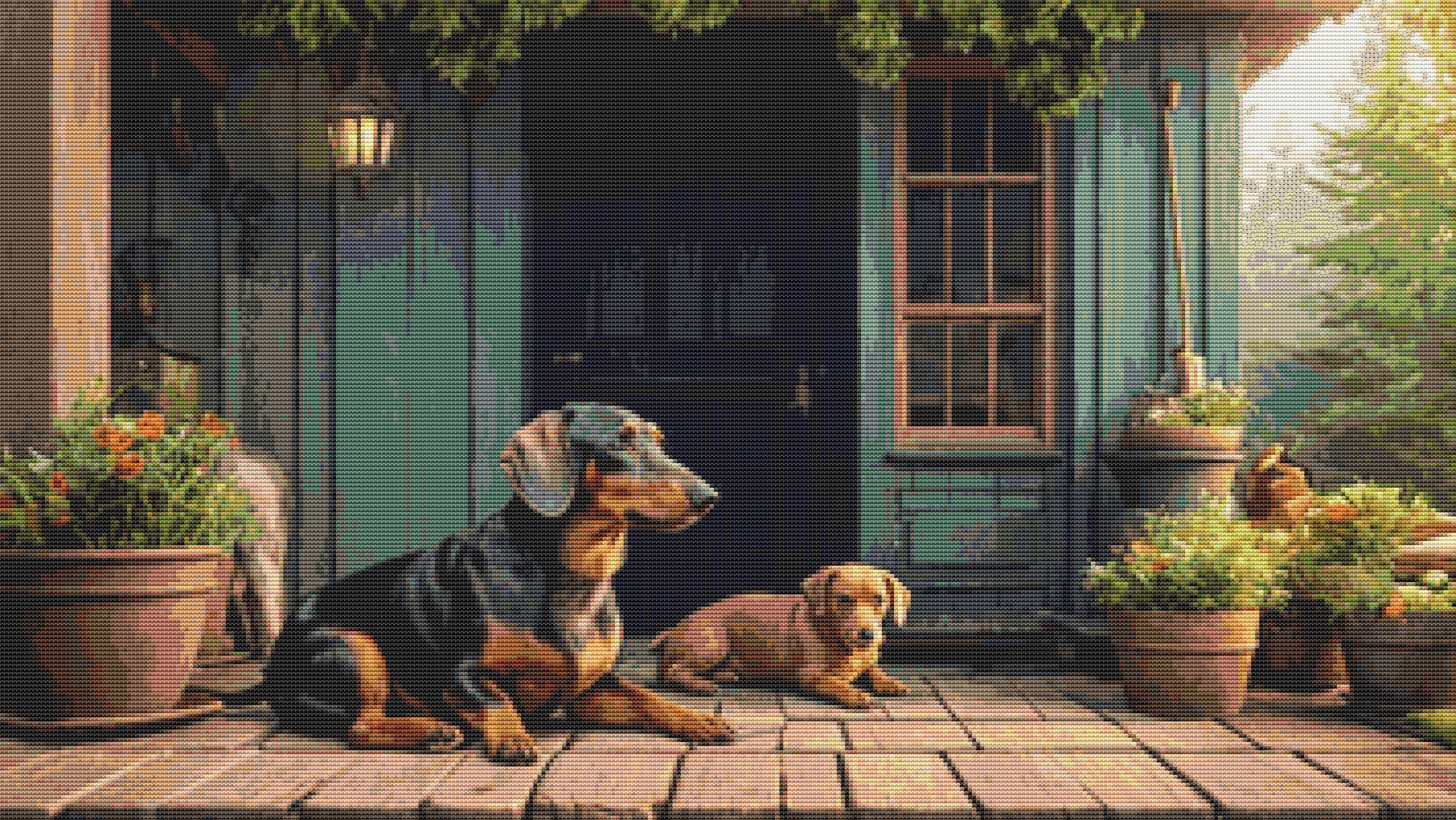Cross Stitch Pattern Dachshunds On The Terrace.