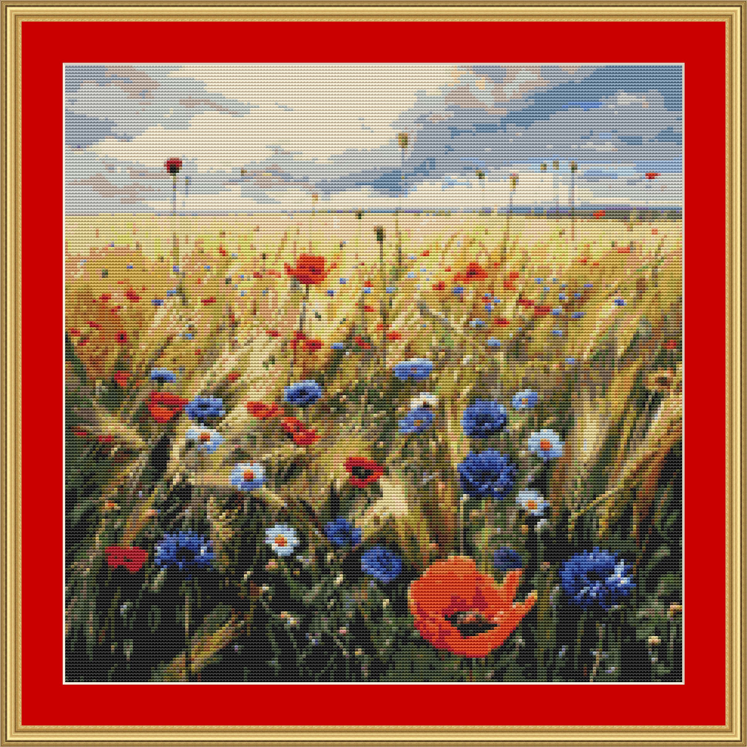 This cross stitch pattern of a field with some blue cornflowers and red poppies.