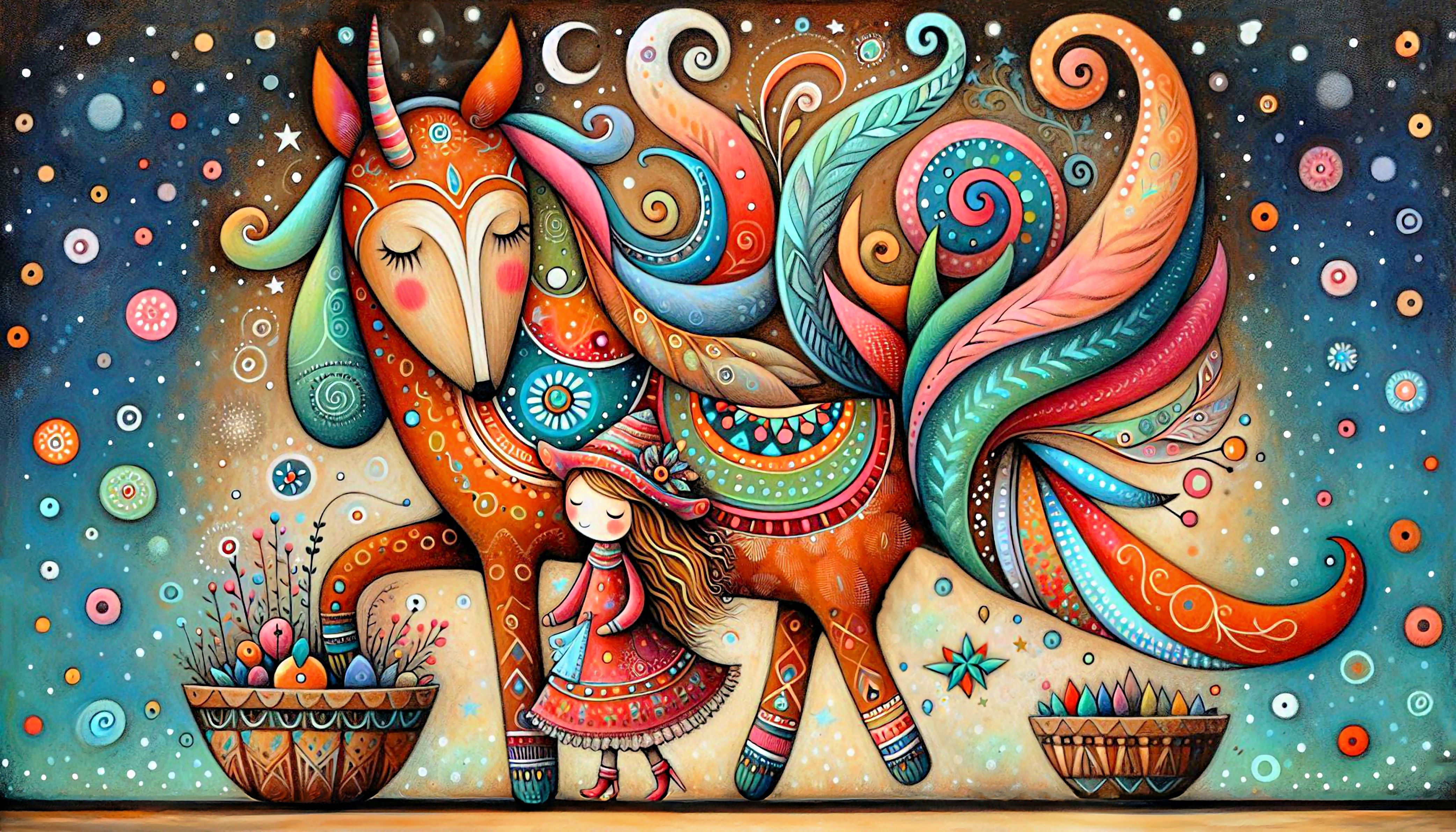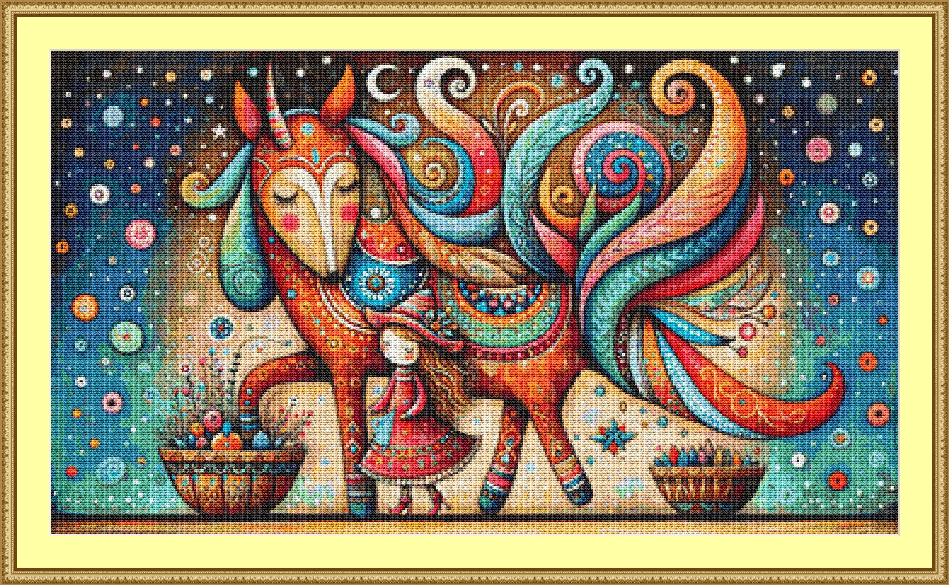 This cross stitch pattern of a beautiful colourful unicorn and a little girl.