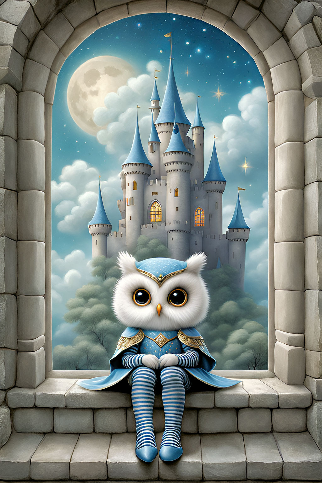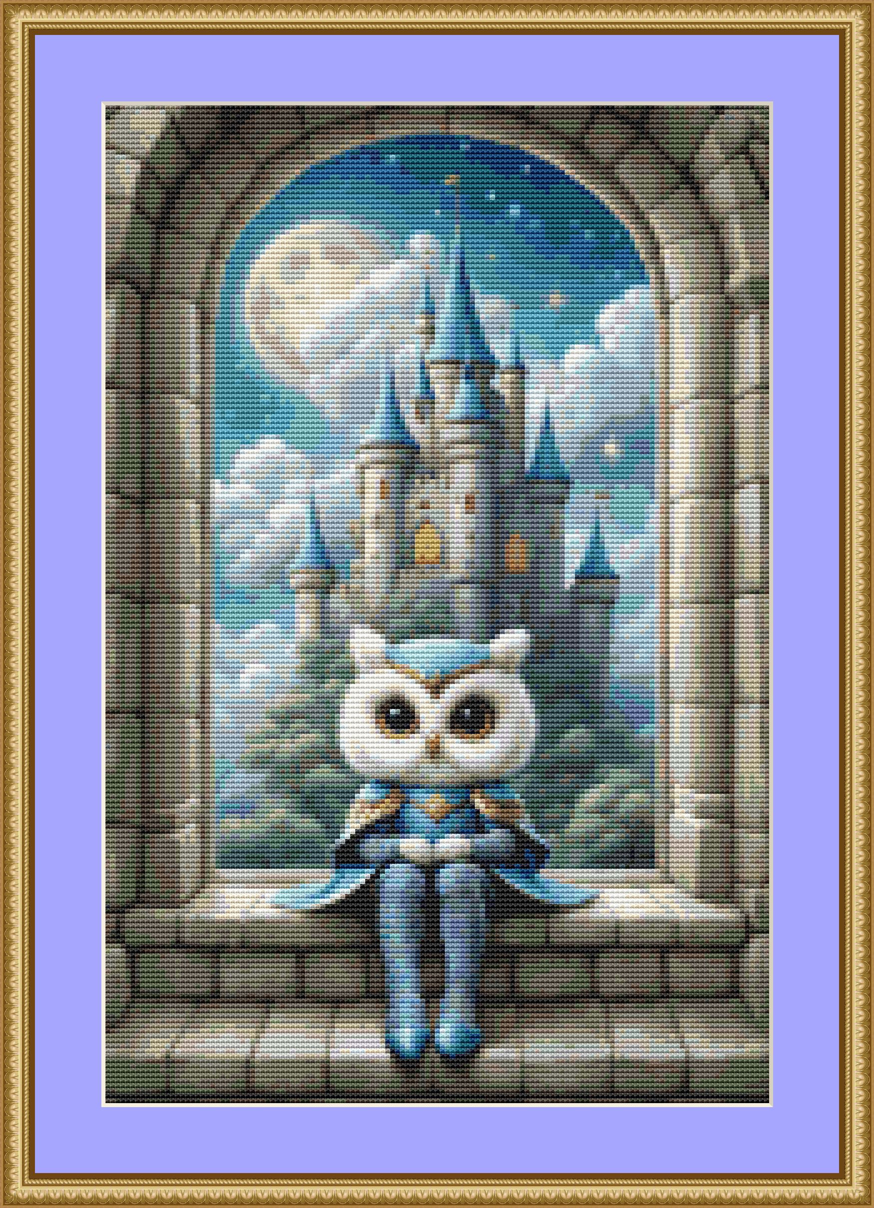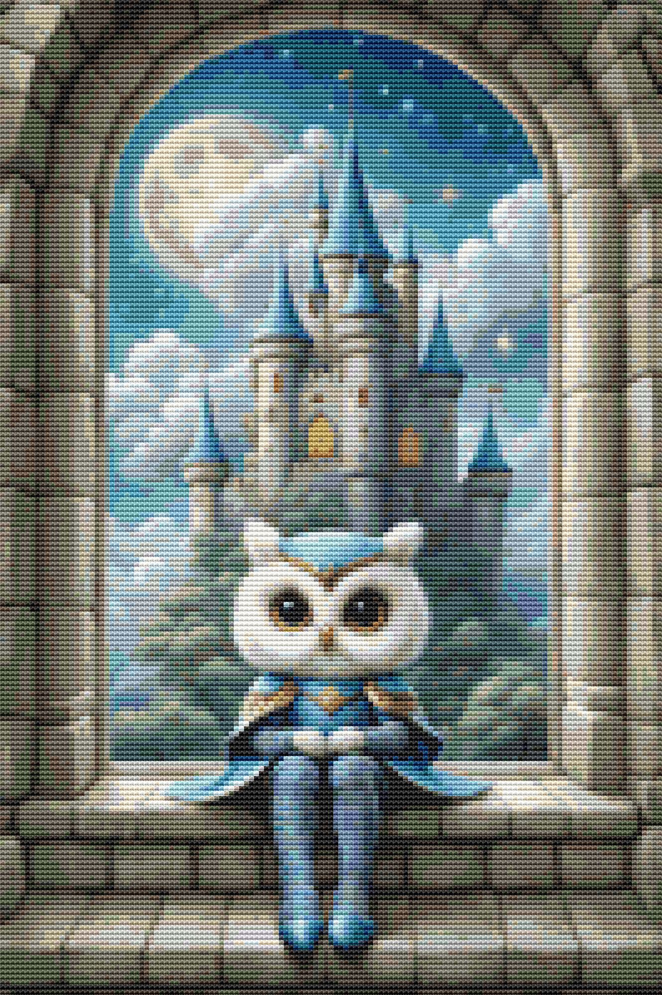 This cross stitch pattern of an owl sitting in a window overlooking a castle.
