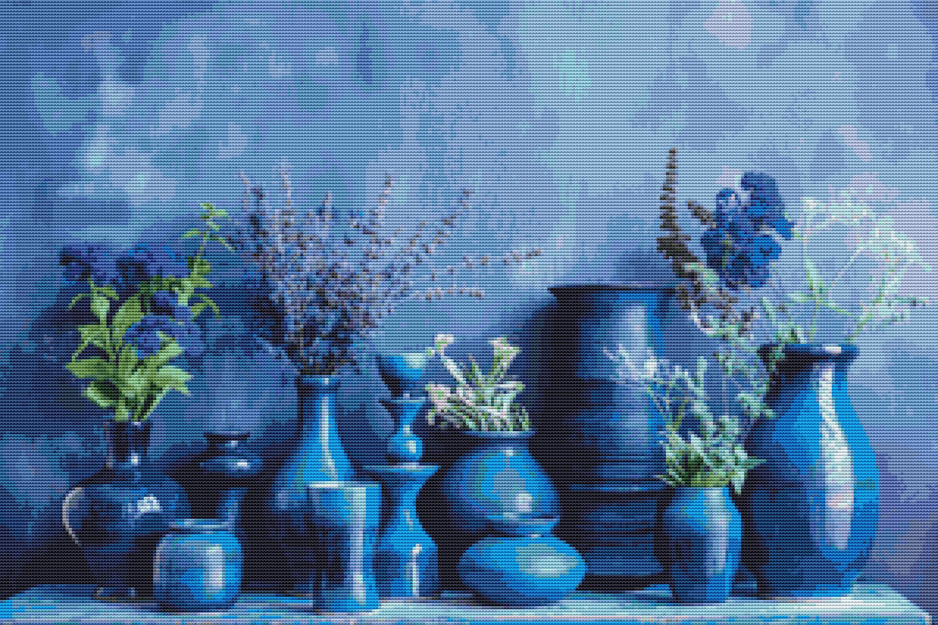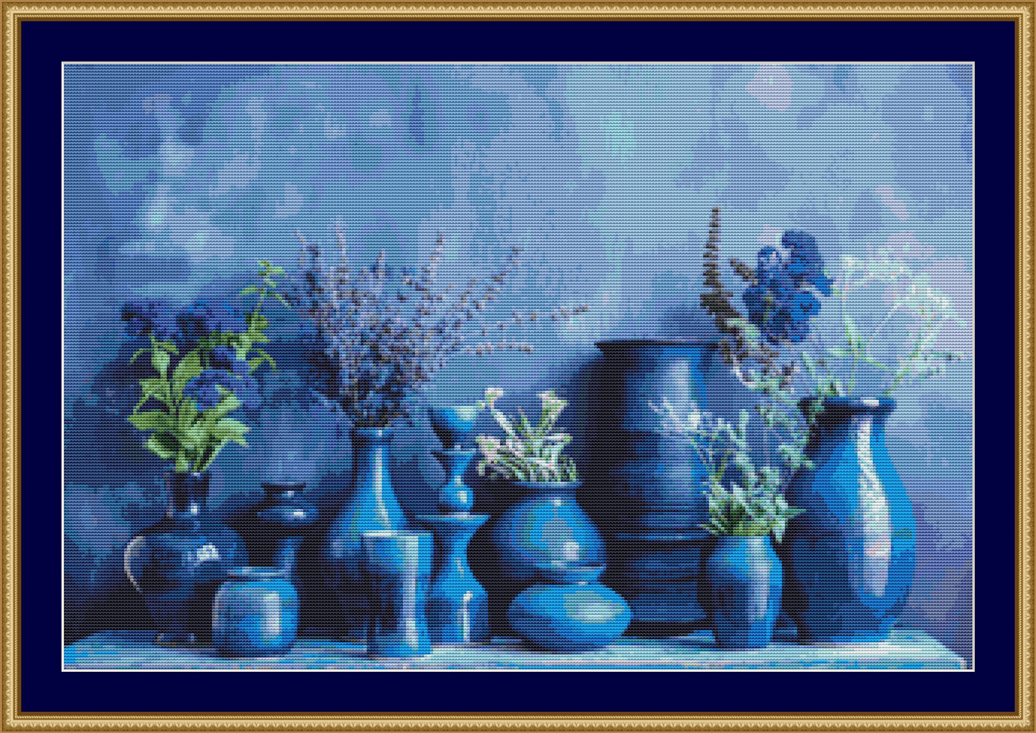 This cross stitch pattern of a display of some beautiful blue pottery.