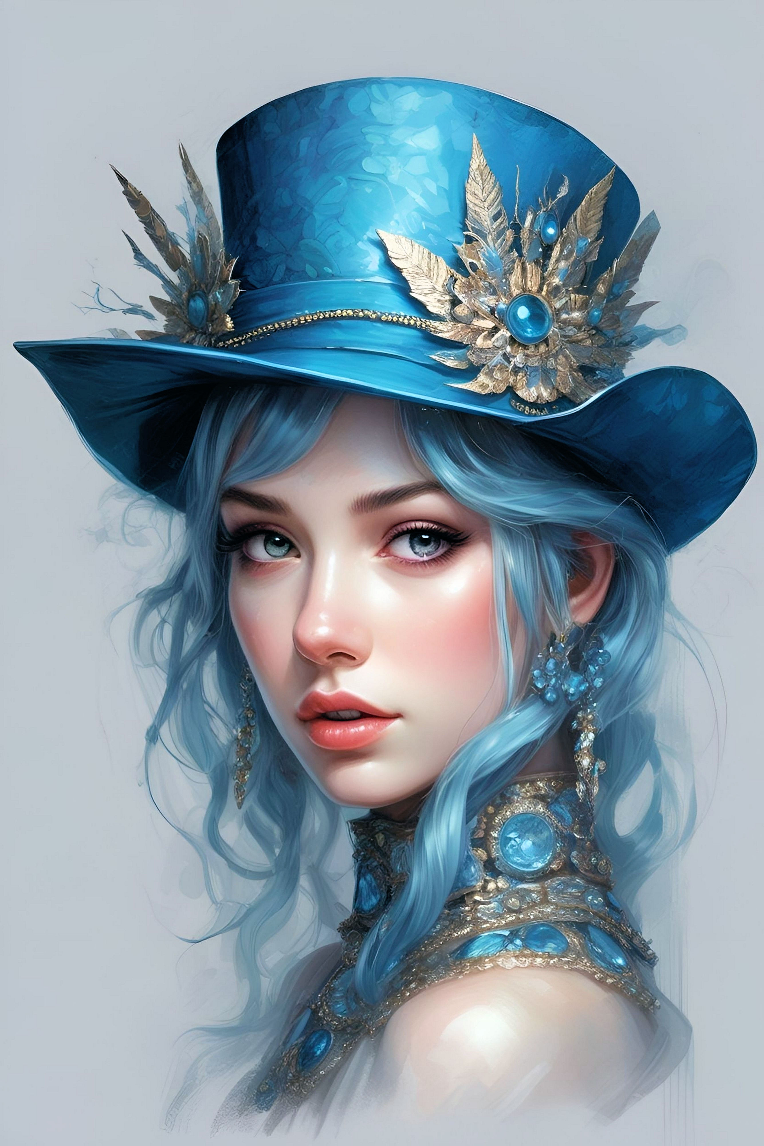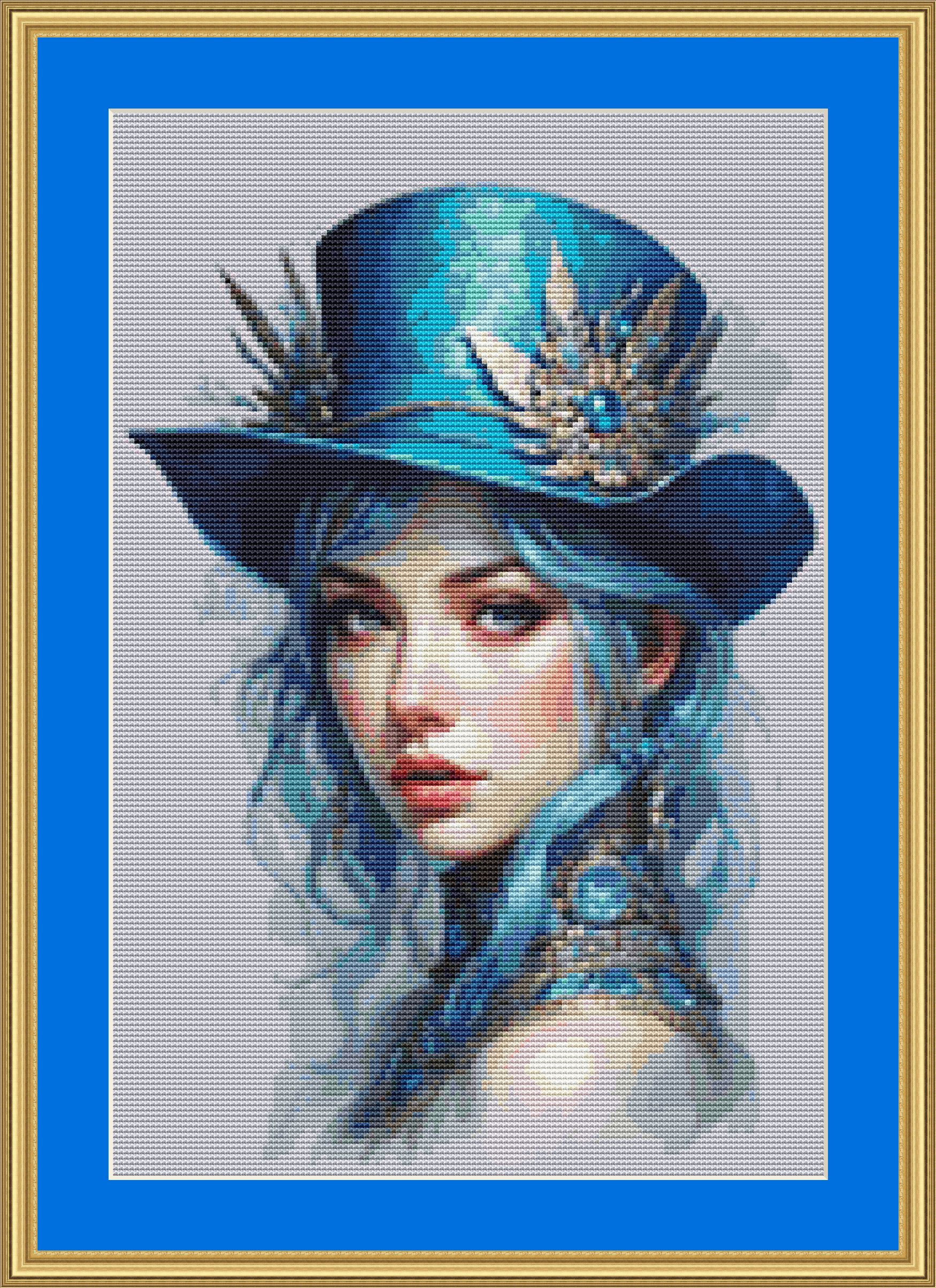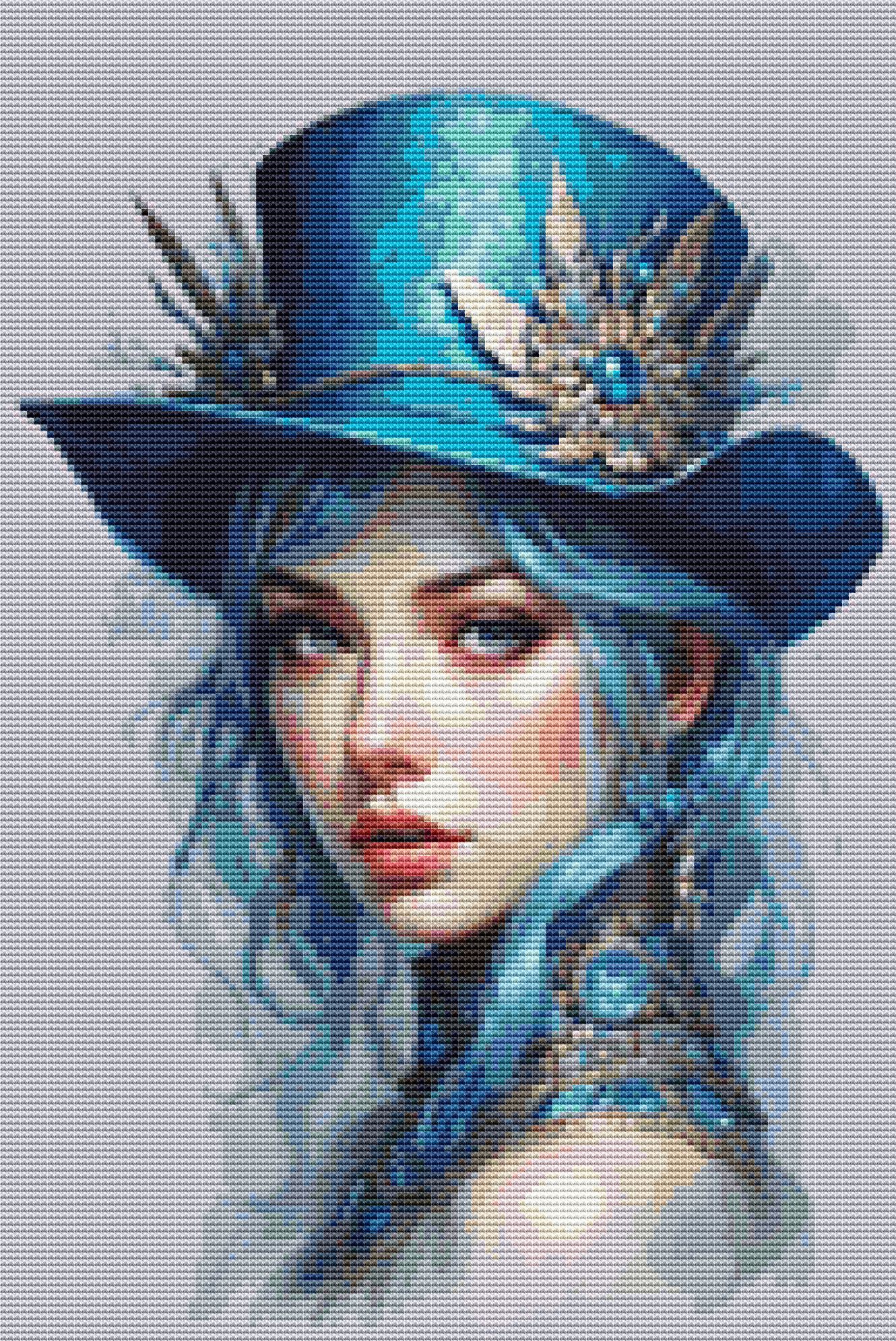This cross stitch pattern of a woman wearing a beautiful blue hat.