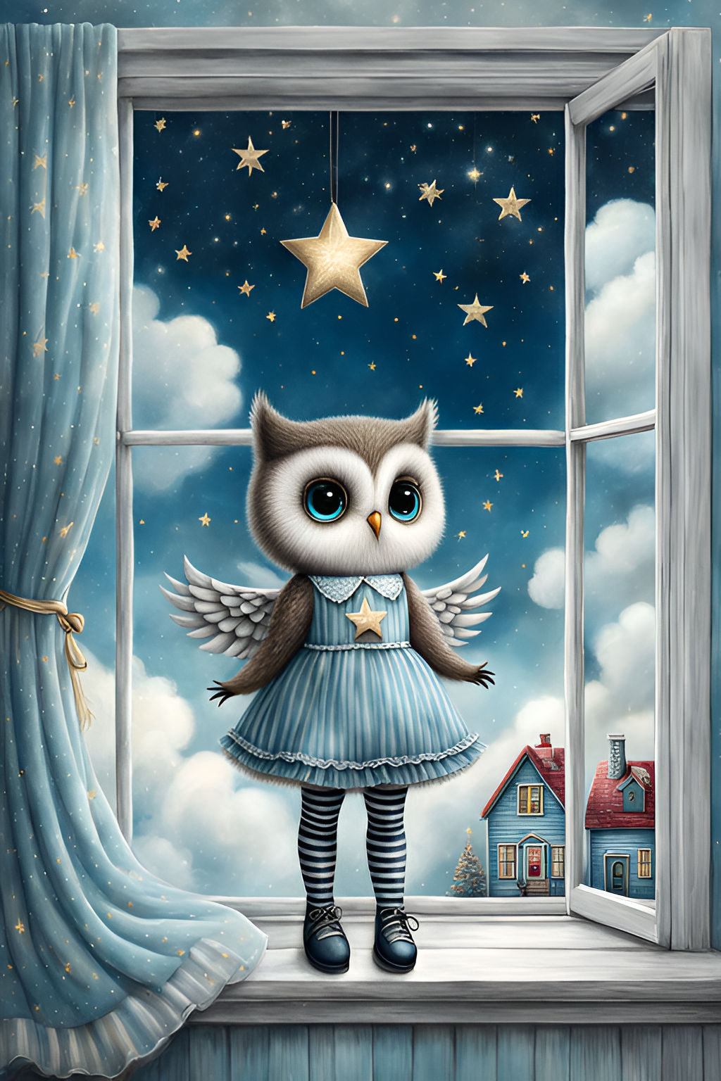 This cross stitch pattern of an angel owl wearing a blue dress.