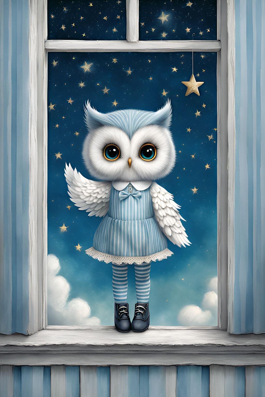 This cross stitch pattern of an owl wearing a pretty blue dress.