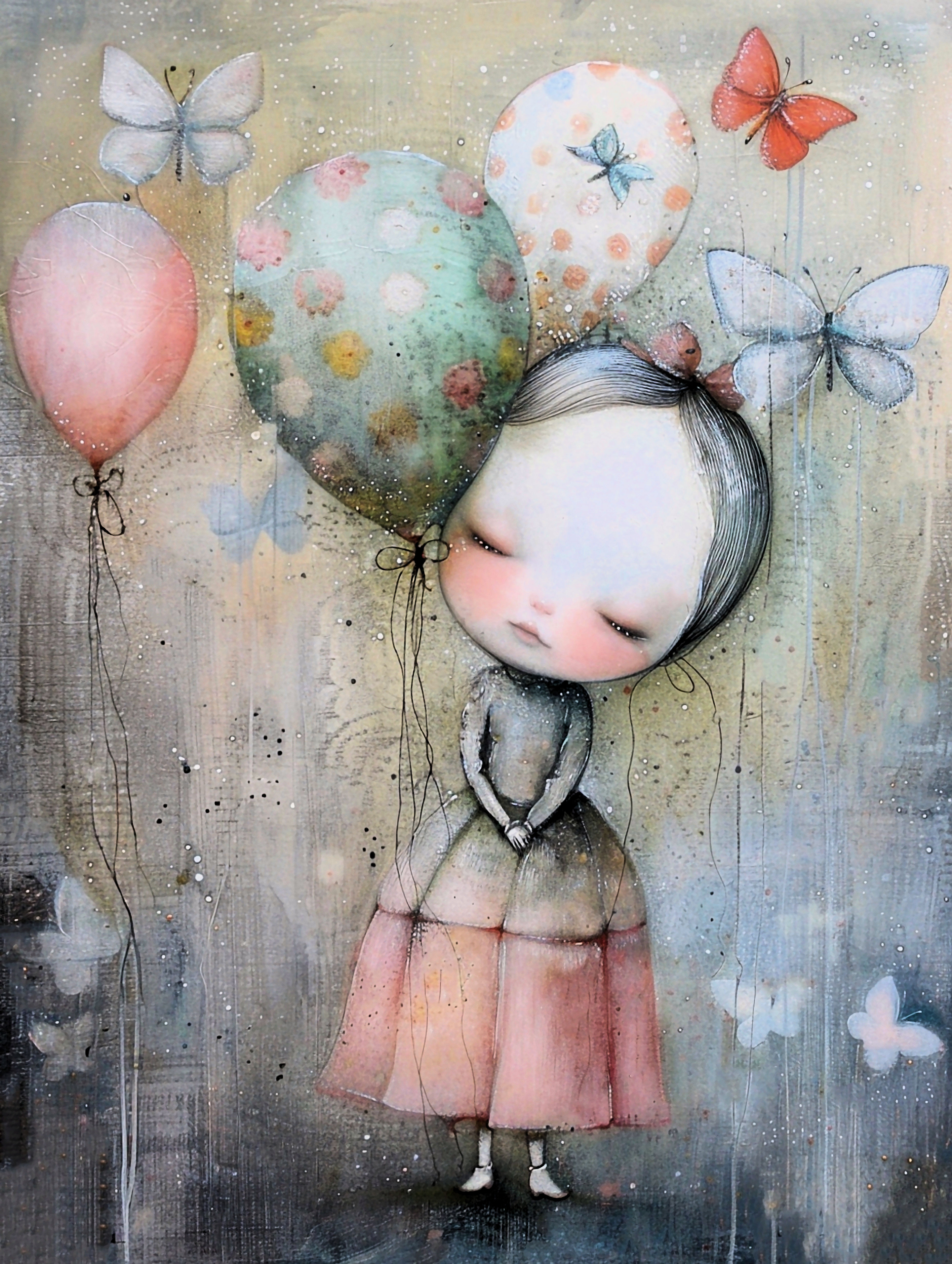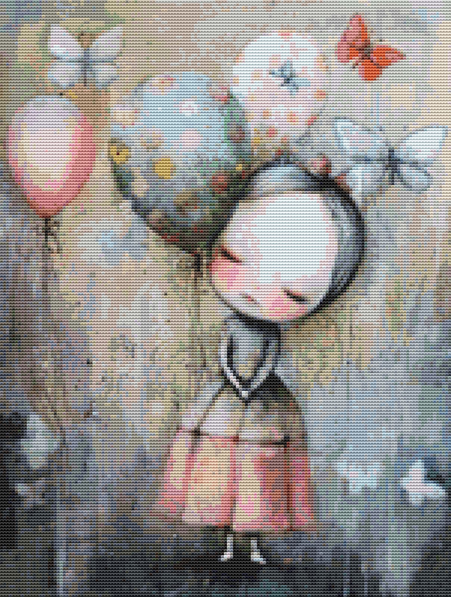 This cross stitch pattern of a girl surrounded by balloons and butterflies.