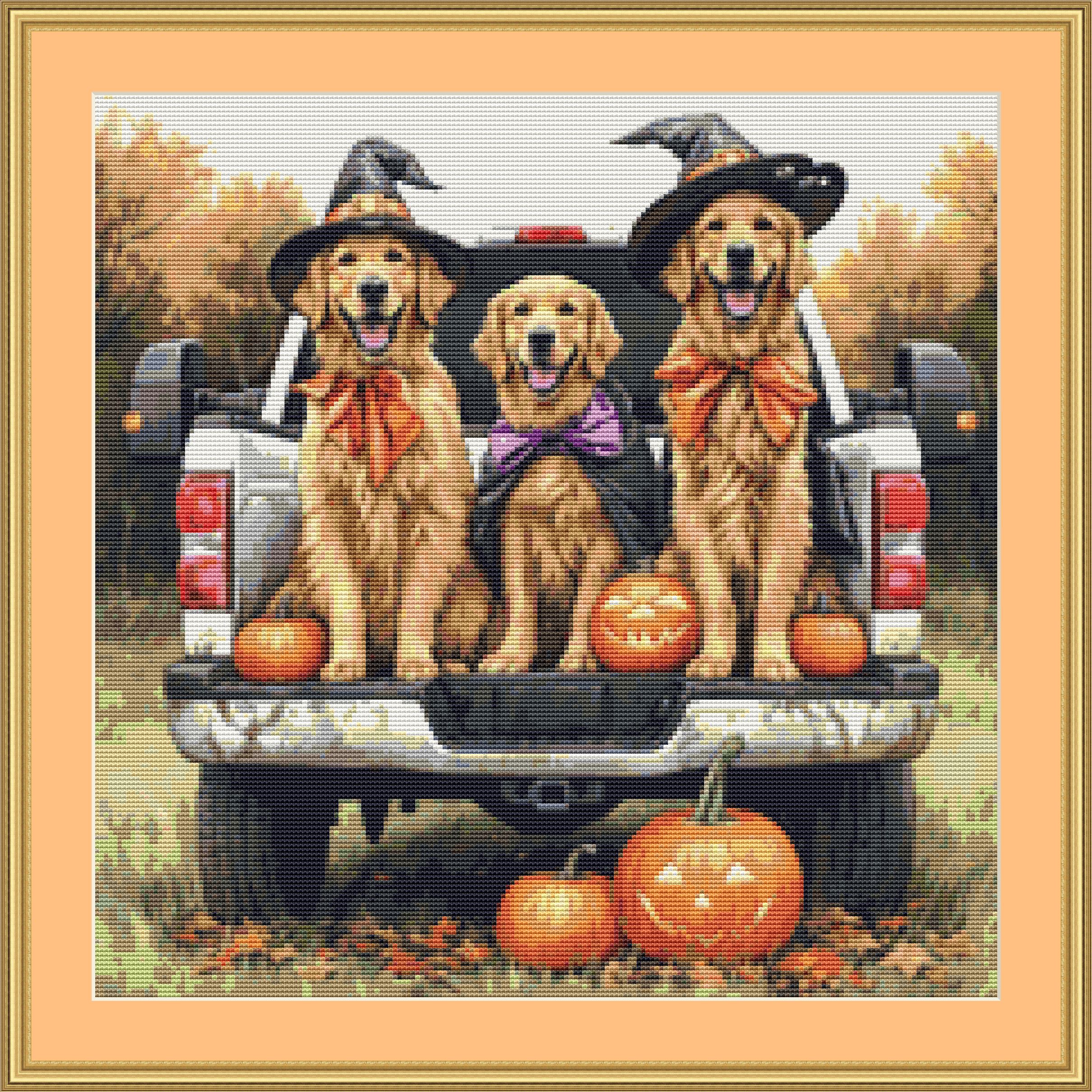 This cross stitch pattern depicts a picture of three dogs dressed in Halloween costumes on the back of the truck.