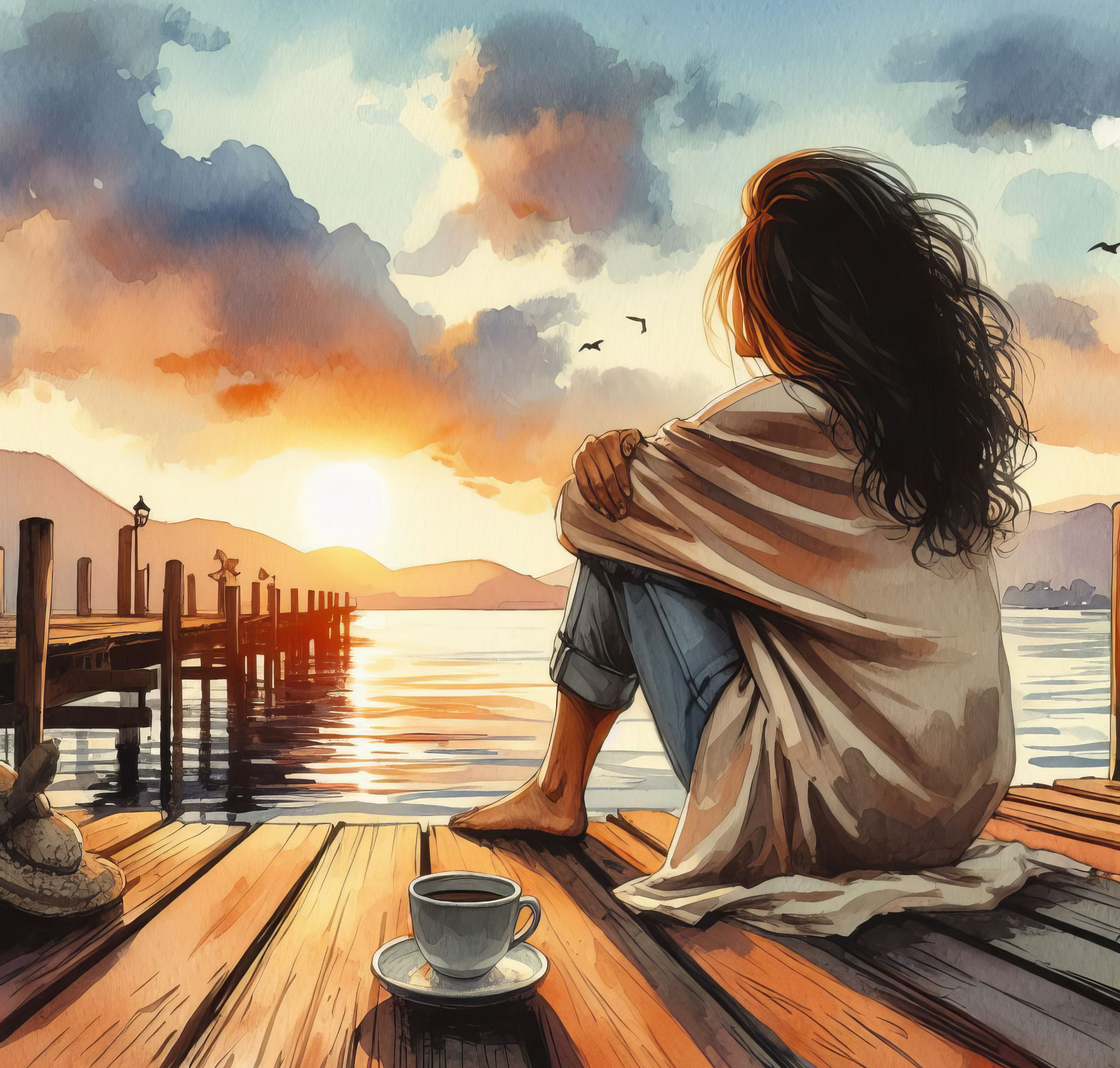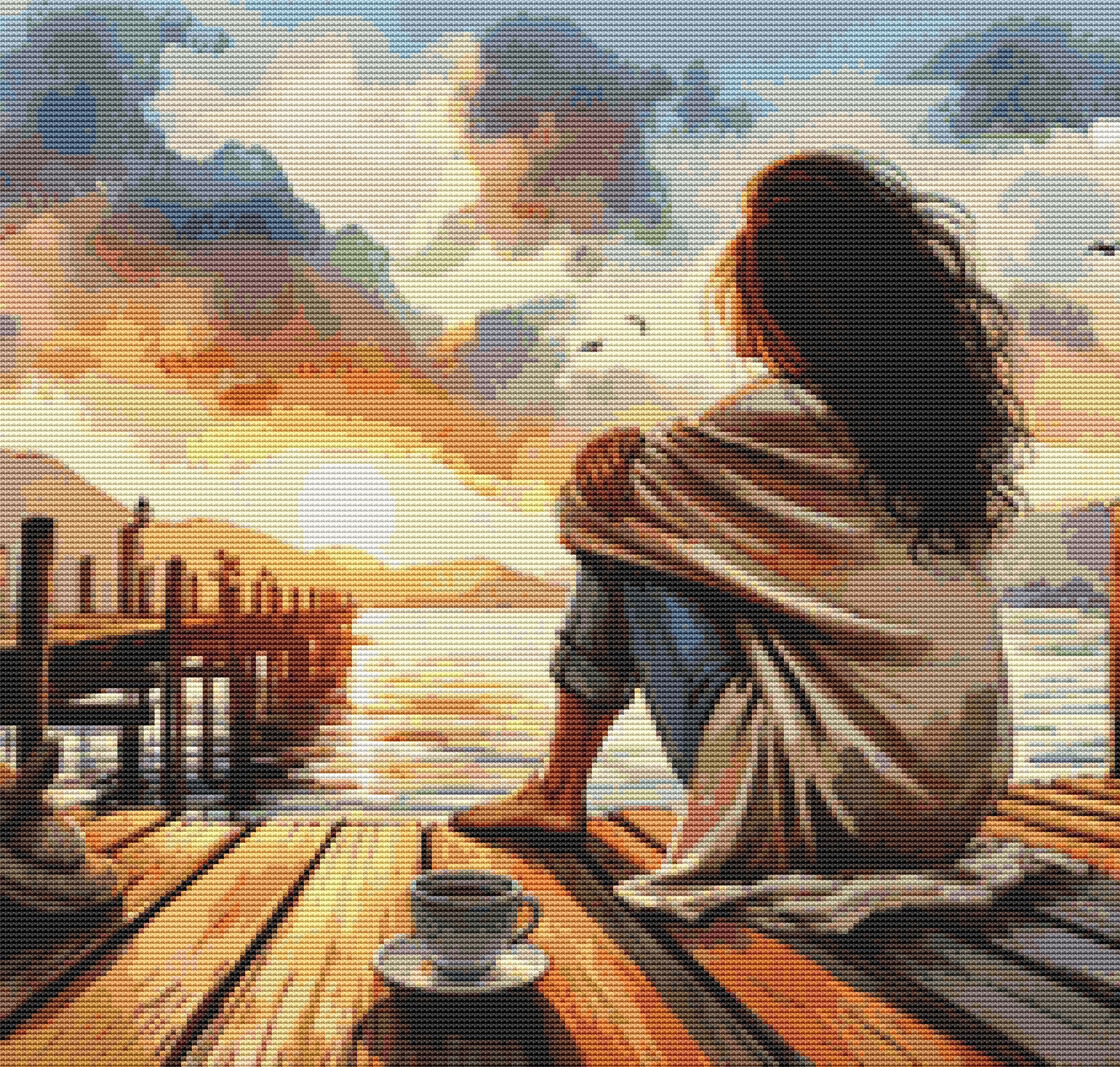 This cross stitch pattern depicts a picture a young woman sitting on a dock over looking the lake while drinking a cup of coffee at sunset.